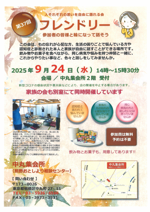 2025.11.04 【熊野包括】本人ミーティング「フレンドリー」10月開催しました。 活動報告 #認知症 #本人ミーティング #認知症本人ミーティング #フレンドリー #熊野おとしより相談センター #認知症の本人や家族がつながる場 2025.09.18 【熊野包括】9月「フレンドリー」のお知らせ お知らせ #板橋区 #フレンドリー #認知症予防 #介護している家族の為に #もの忘れ #熊野おとしより相談センター 2025.06.09 【熊野包括】認知症本人ミーティング・家族会フレンドリー開催しました 活動報告 #認知症本人ミーティング #フレンドリー #認知症家族会 2025.05.12 【熊野包括】令和7年度最初のフレンドリー開催しました 活動報告(IN) #認知症本人ミーティング #フレンドリー 2024.12.17 【熊野包括】人それぞれの思いを自由に語れる場 🌸フレンドリー🌸 ご案内 お知らせ #フレンドリー #熊野包括 #熊野おとしより相談センター #もの忘れ #認知症 #中丸集会所 2024.11.27 【熊野包括】令和6年10月 認知症の本人と輪になって話そう「フレンドリー」が開催されました。 活動報告 #認知症本人ミーテイング #フレンドリー #もの忘れ #家族会 2024.09.14 【熊野包括】認知症の本人と輪になって話そう「フレンドリー」9月のお知らせです。 お知らせ #認知症本人ミーティング #フレンドリー 2024.07.13 【熊野包括】認知症の当事者と語る会23回「フレンドリー」開催しました 活動報告 #フレンドリー #認知症本人ミーティング #認知症当事者 #熊野おとしより相談センター 2023.12.23 【熊野包括】第16回 認知症の本人と輪になって話そう 「フレンドリー」を開催しました。 活動報告 #熊野おとしより相談センター #フレンドリー 2023.12.06 【熊野包括】第15回 認知症の人と輪になって話そう「フレンドリー」を開催しました。 活動報告 #認知症本人ミーティング #フレンドリー #参加者募集 2023.11.29 【熊野包括】第14回 認知症本人ミーティング 「フレンドリー」が開催されました。 活動報告 #認知症 #認知症本人ミーティング #フレンドリー #参加者募集