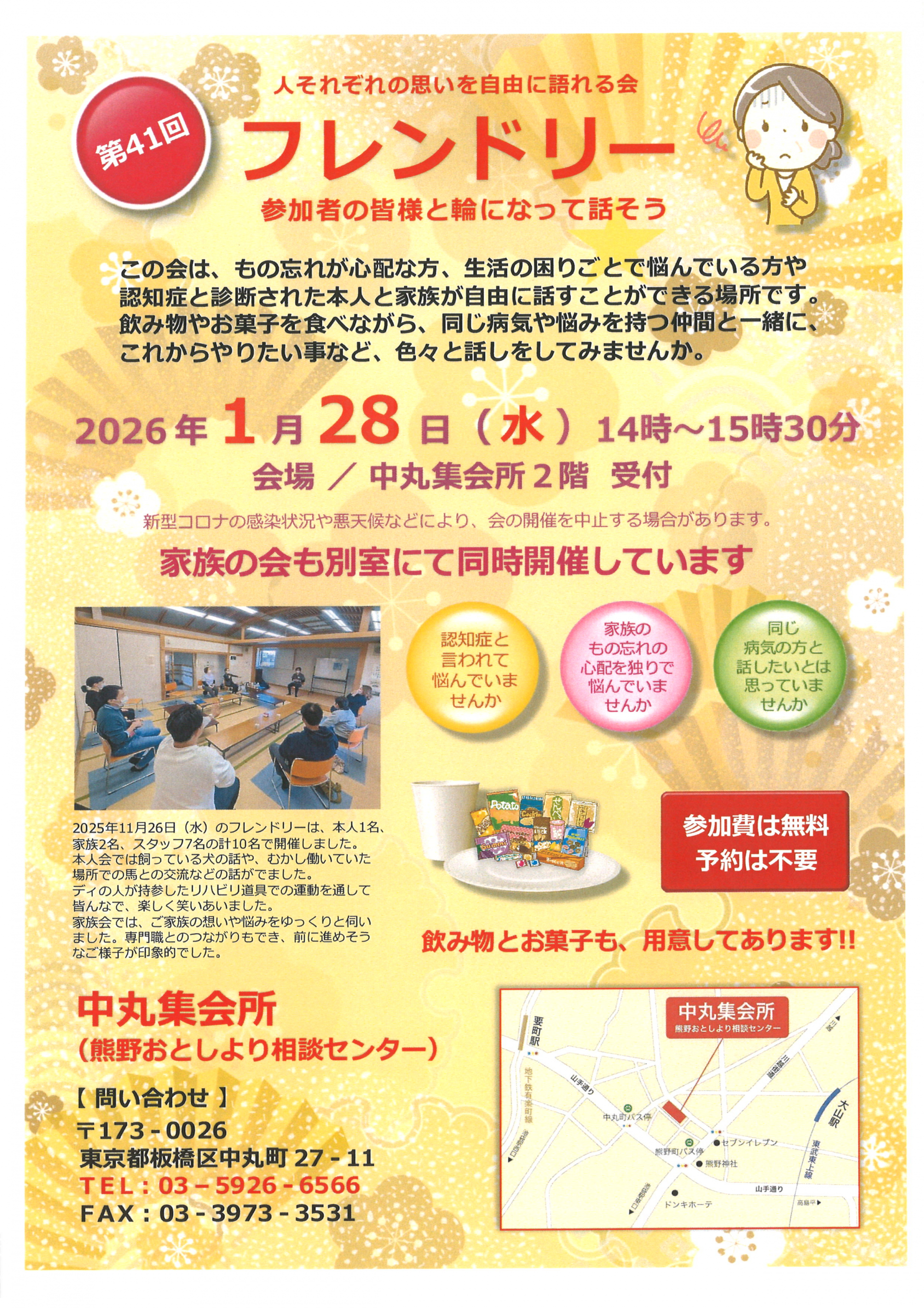 1月の「フレンドリー」は 28日(水)14時~15時半に中丸集会所で開催します。