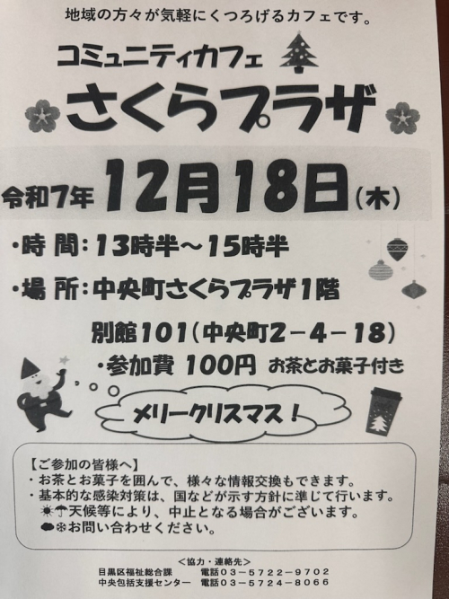 2026.01.05 【目黒中央包括】八重の会次回開催日のお知らせ。 活動報告 2025.12.15 【目黒中央包括】災害時の備えについて 活動報告 2025.12.15 【目黒中央包括】12/19高齢者センターにて、出張相談会を開催します。 活動報告 2025.12.15 【目黒中央包括】中央地区介護者の会「八重の会」開催されました。 活動報告 2025.12.13 【目黒中央包括】油面ときわ会(竹の子クラブ)さんのお誕生日会に出席いたしました お知らせ 2025.12.13 【目黒中央包括】黄色のじゅうたん お知らせ 2025.12.13 【目黒中央包括】ケアマネカフェくじらに参加しました! 活動報告 2025.12.13 【目黒中央包括】「ホームページのご案内」が新しくなりました! お知らせ 2025.12.13 【目黒中央包括】目黒区高次脳機能障害者支援セミナーのごあんない お知らせ 2025.12.13 【目黒中央包括】笑って学ぶ 消費生活講座 お知らせ 2025.12.13 【目黒中央包括】めぐろ福祉 しごと相談会 お知らせ 2025.12.13 【目黒中央包括】寒くなってまいりました お知らせ 2025.12.13 【目黒中央包括】通いの場に興味のある方へ お知らせ 2025.12.13 【目黒中央包括】12月のコミュニティカフェ さくらプラザ お知らせ 2025.12.08 【目黒中央包括】歳末たすけあい・地域福祉募金に中央包括として協力しました。 活動報告 1 2 3 4 … 31