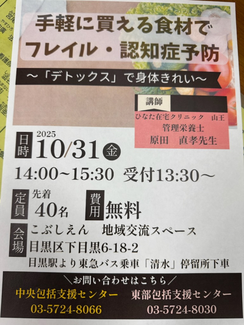 2025.10.25 【目黒中央包括】コミュニティカフェに参加しました。 活動報告 2025.10.25 住まいの防火防災診断 お知らせ 2025.10.25 中央まるごと支え合い ナビステーション in スポルテ目黒 お知らせ 2025.10.25 手軽に買える食材で、フレイル・認知症予防! お知らせ 2025.10.25 今月も中央地区ケアマネ幹事会を開催しました! 活動報告 2025.10.23 【目黒区中央包括】油面住区センターにて福祉用具体験会を行いました お知らせ 2025.10.23 【目黒中央包括】民生委員さんに向けて通いの場MAPを配布いたしました お知らせ 2025.10.23 目黒区在宅療養 相談業務向上研修に参加しました! 活動報告 2025.10.23 東京医療センター 地域医療連携の会に参加しました! 活動報告 2025.10.22 【目黒中央包括】高齢者センター出張相談会を開催します。 お知らせ 2025.10.20 【目黒中央包括】見守りボランティア連絡会開催しました。 活動報告 2025.10.17 上目黒出張相談会に行ってきました! 活動報告 2025.10.10 【目黒中央包括】コミュニティカフェのご案内 お知らせ 2025.10.08 【目黒中央包括】きんもくせいの花が咲き始めました。 お知らせ 2025.10.06 【目黒中央包括】上目黒いこいの家相談会 開催します。※曜日代わります※ お知らせ 1 … 3 4 5 6 7 … 32