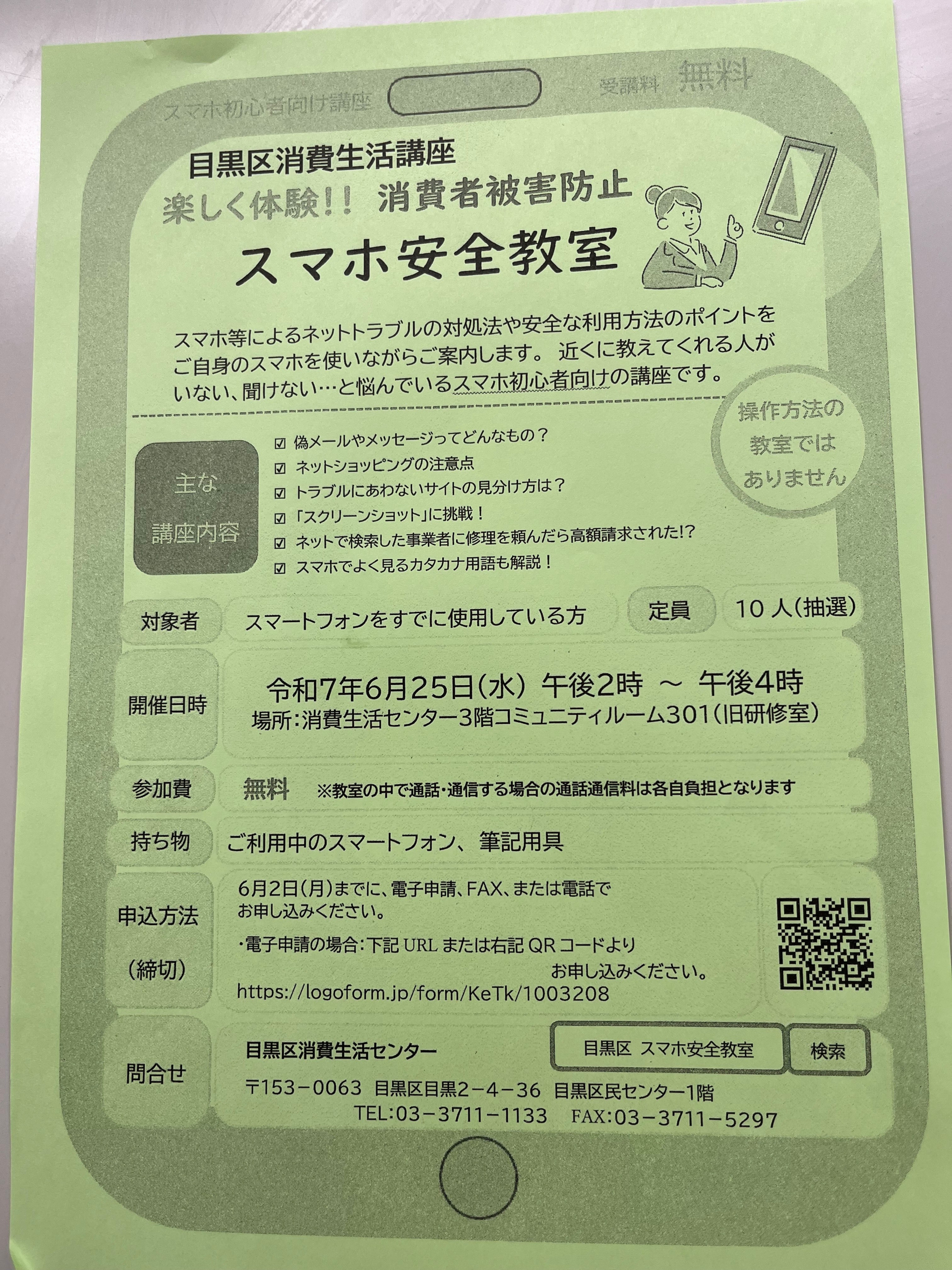 目黒区消費生活センター主催目黒区消費生活講座「スマホ安全教室」のご案内