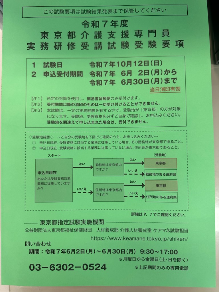 令和7年度 東京都介護支援専門員 実務研修受講試験受験要項が届きました。