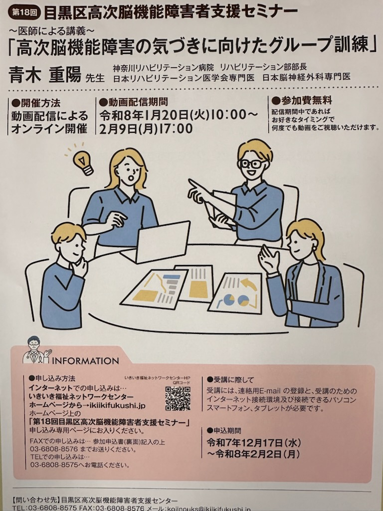「高次脳機能障害の気づきに向けたグループ訓練」のセミナーが、オンラインにて開催されるそうです。