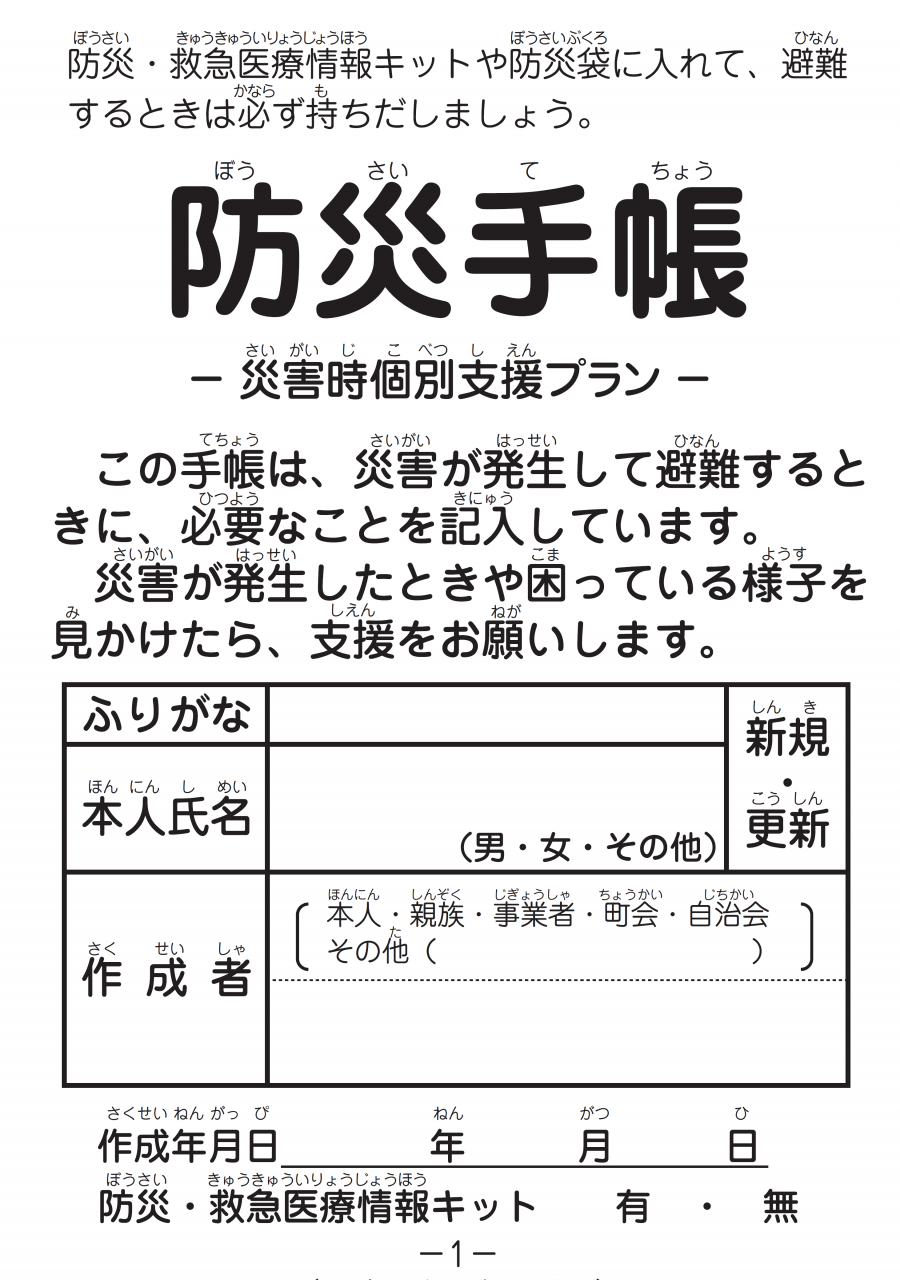 緊急時の連絡先や医療情報など本人にかかわる情報を防災手帳に記入、必要な際にすぐにもちだせるようなところに置いておきます。