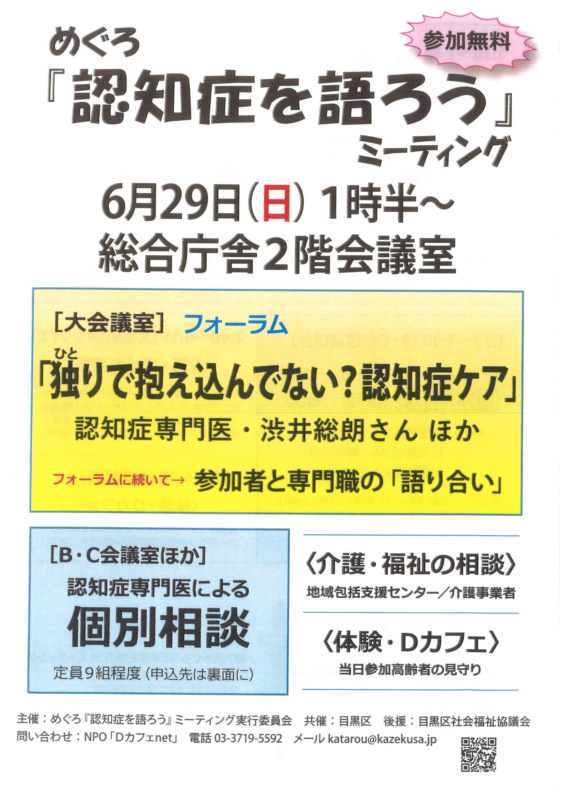 認知症を語ろうミーティングは目黒区とDカフェnetが共催で年に1回開催している、認知症について考えるイベントです。