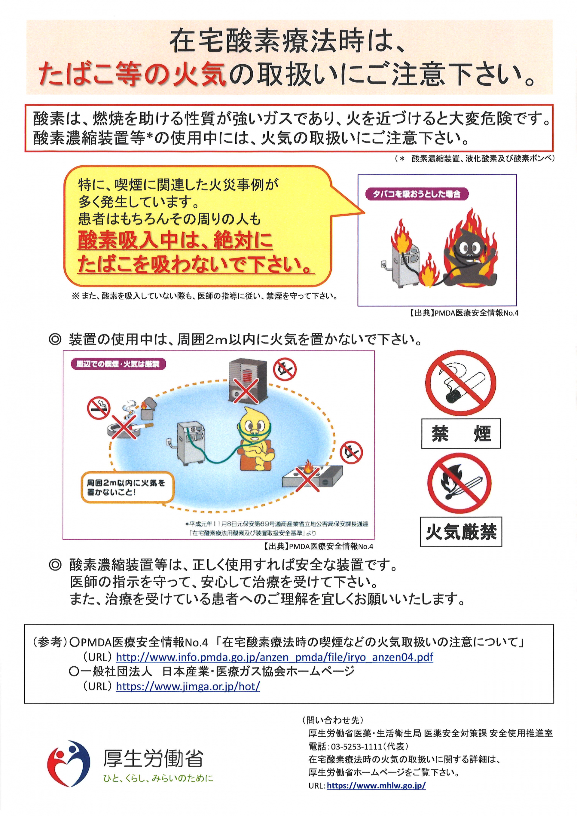 2024.12.19 活動報告 【みどりの苑居宅】在宅酸素と火気の取り扱い Tweet シェアする 在宅酸素療法をされている方には特に注意!喫煙されている方は更に注意が必要です。装置の使用中には周囲2m以内にストーブ🔥、ガステーブル🔥、タバコ🚬、ライター🔥等の火気厳禁です。 前の記事 2024.12.24 活動報告 【みどりの苑居宅】クリスマスイブ 次の記事 2024.12.19 活動報告 【みどりの苑居宅】認知症声かけ訓練 一覧へ戻る
