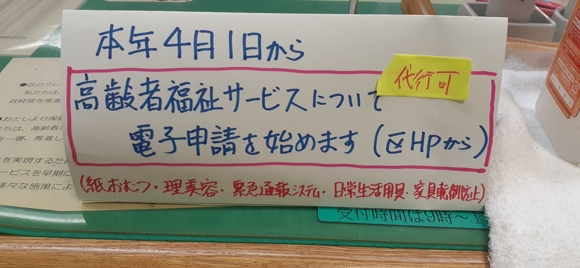 2025.03.14 活動報告 【みどりの苑居宅】電子による申請 Tweet シェアする 本日近隣のおとしより福祉センターに行った際に窓口に「4月から紙オムツ、理美容他が電子申請でできるようになります。」と告知されていました。他区では既に行われてる事は聞いておりましたが板橋区でもようやく電子申請できるようになって有難いと思います。窓口に行かないで済む事はできるだけ多い方がいいですね。 OM 前の記事 2025.03.17 活動報告 【みどりの苑居宅】みまもるあにまる 次の記事 2025.03.14 活動報告 【みどりの苑居宅】今月のウェルカムまんなか 一覧へ戻る