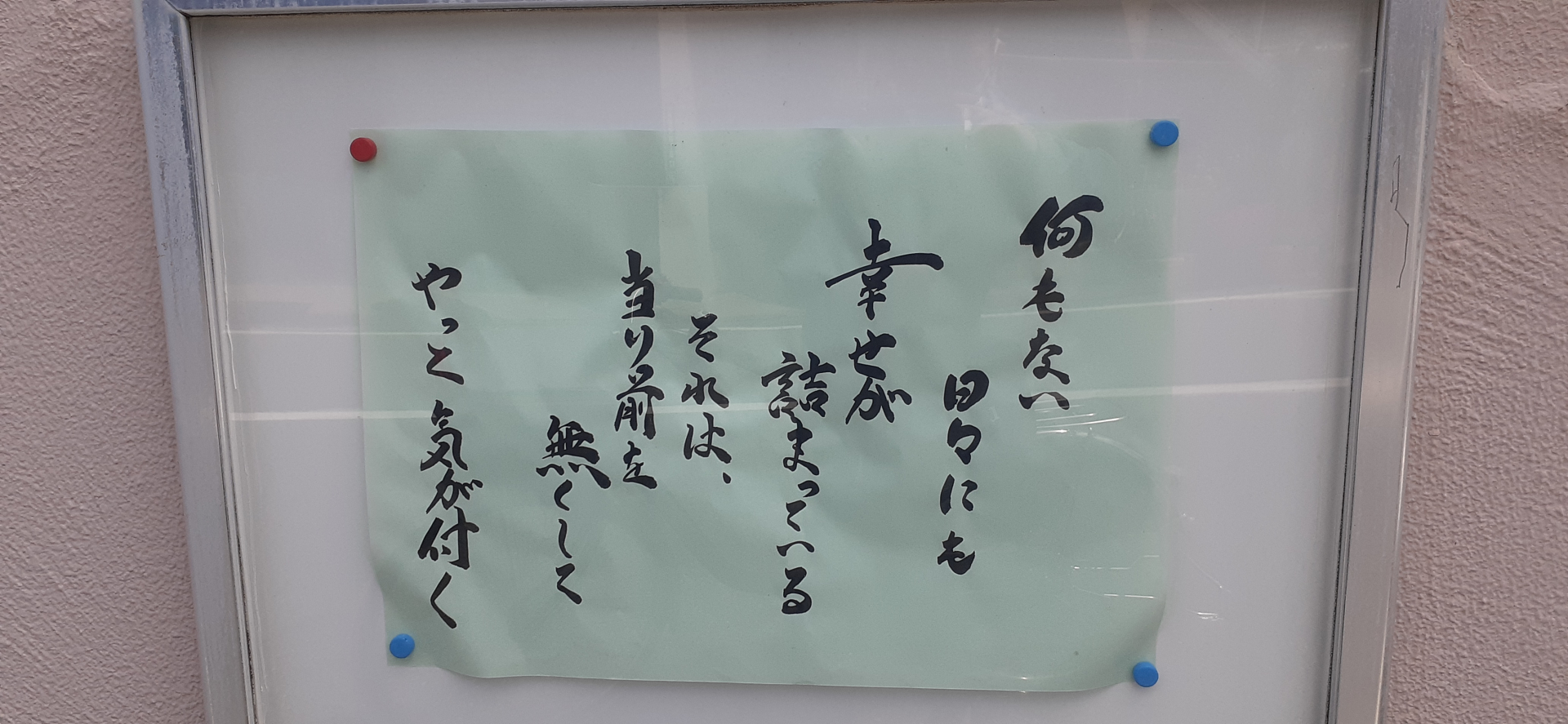 2025.04.14 活動報告 【みどりの苑居宅】為になる言葉 Tweet シェアする 近隣のお寺の壁に毎月短文等が掲示されています。たまに自転車を止めて見るとなるほどと思わせてくれる物があります。今回はそのいくつかを載せてみます。 OM 前の記事 2025.04.15 活動報告 【みどりの苑居宅】季節の移り変わり 次の記事 2025.04.10 活動報告 【みどりの苑居宅】みどりの苑はみどりでいっぱい。 一覧へ戻る