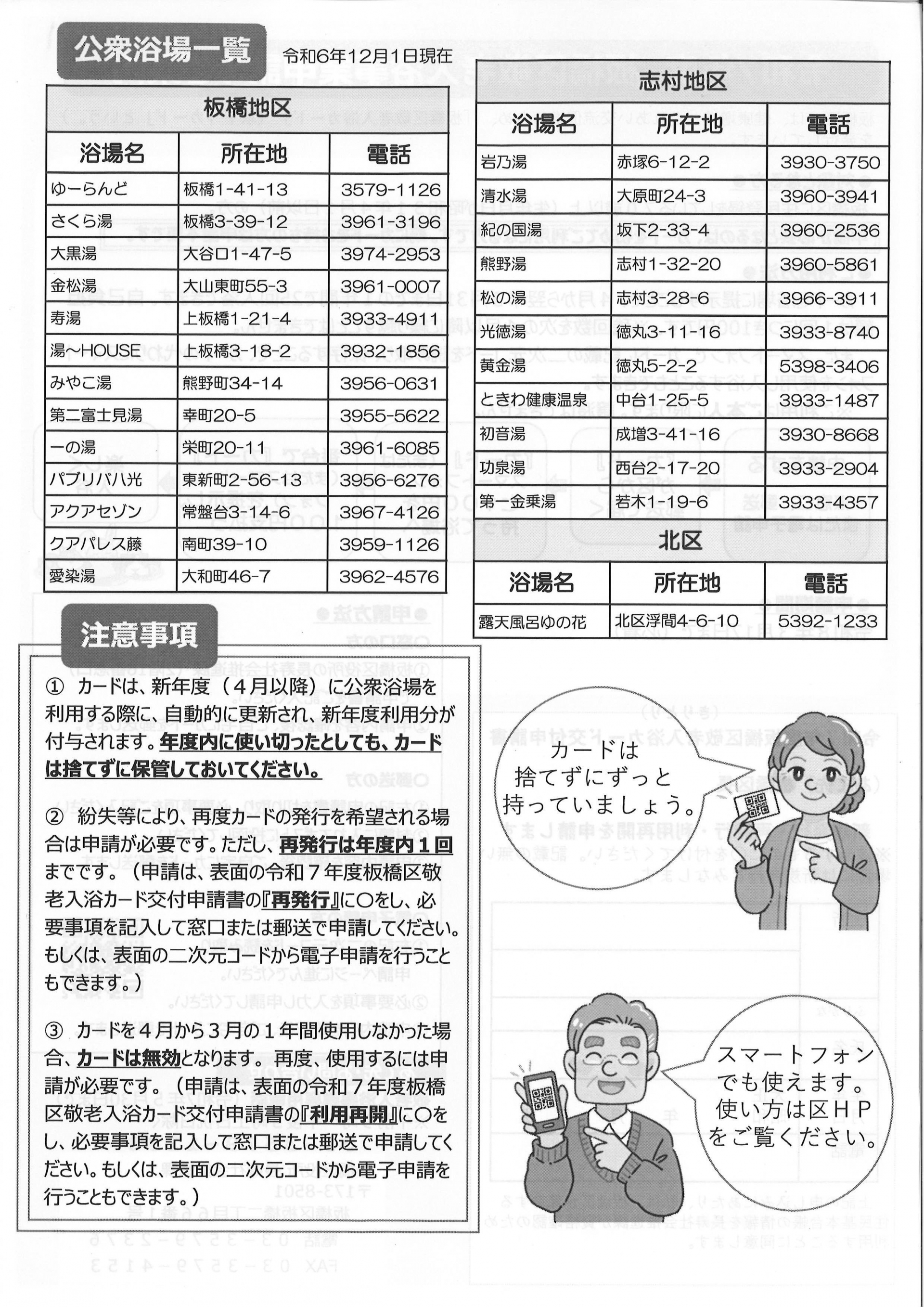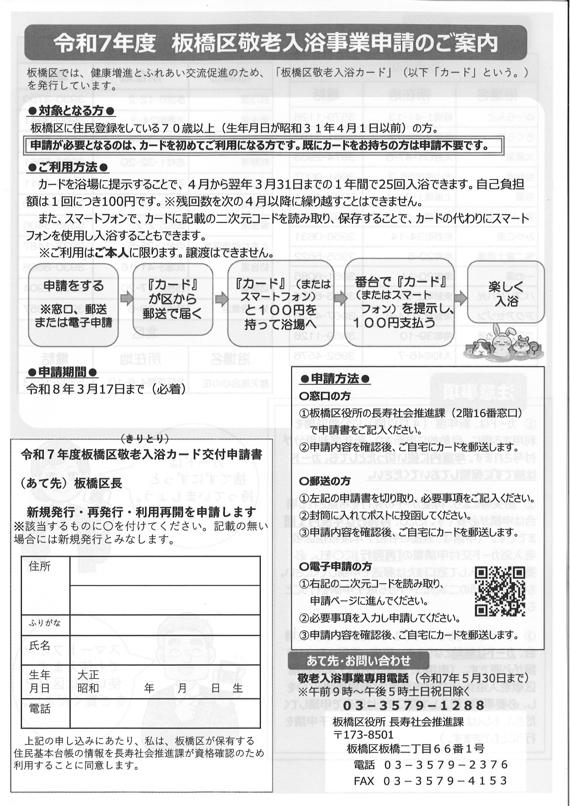 2025.04.22 活動報告 【みどりの苑居宅】板橋区敬老入浴事業 Tweet シェアする 新年度になり令和7年度板橋区敬老入浴事業申請のご案内がきておりました。以前は入浴券でしたが今はカード又はスマホを使い100円の自己負担金で入浴ができます。自宅に浴室がある方でも銭湯が好きで行かれる方はまめに温まりに行きます。お風呂好きの方には良い制度ですね。 OM 前の記事 2025.04.23 活動報告 【みどりの苑居宅】雨とクジャペン 次の記事 2025.04.21 活動報告 【みどりの苑居宅】本年度版 ハートページ 一覧へ戻る