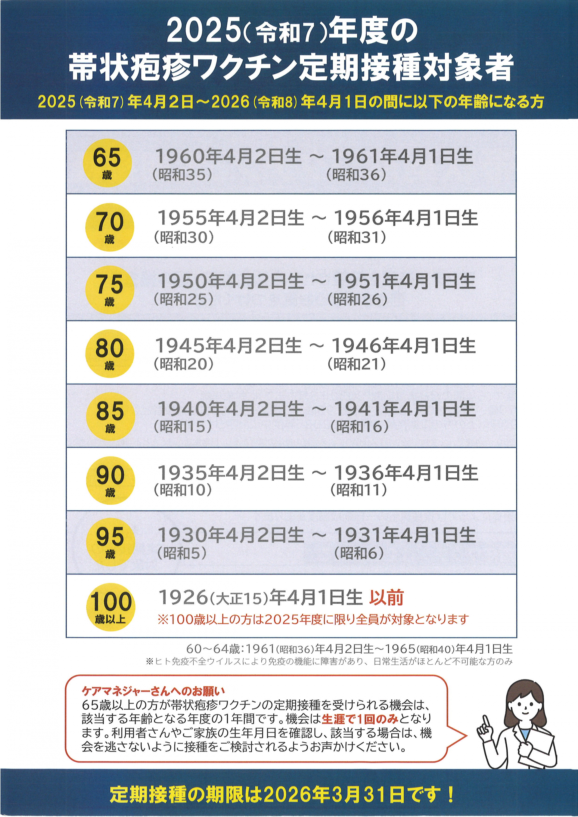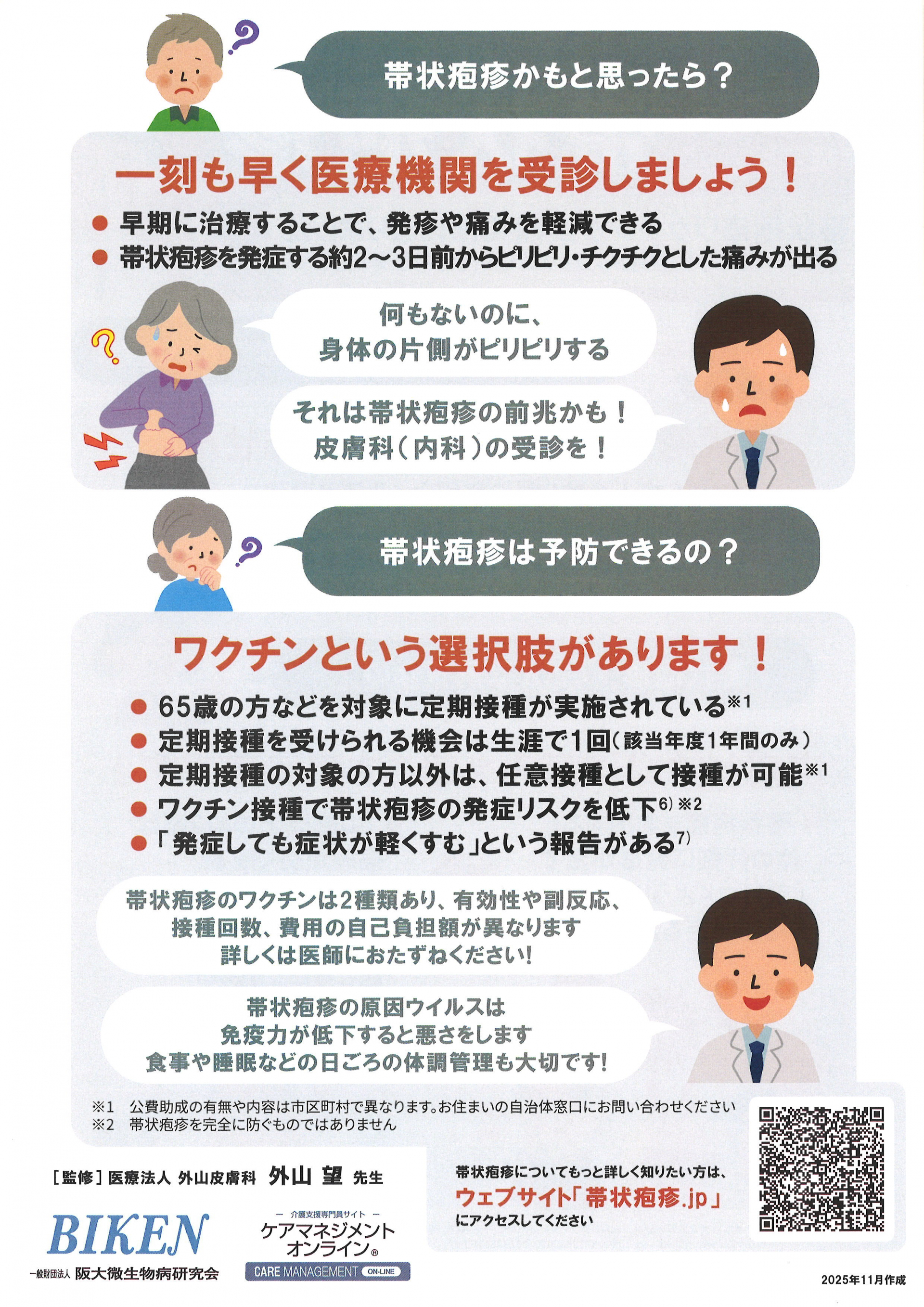 2025.12.05 活動報告 【みどりの苑居宅】帯状疱疹ワクチン Tweet シェアする 2025年より帯状疱疹ワクチンが定期接種になったのはご存じでしょうか?50歳代から発症率が高くなると言われている帯状疱疹。私も昨年夏に初めて罹り3か月ほど後遺症に悩まされました。ワクチンの効果についてはまだ接種してないのでわかりませんがなった時の辛さを考えたら早めに接種しておいた方がよいかと思いました。OM 前の記事 2025.12.08 活動報告 【みどりの苑居宅】事例研究発表会冊子届きました 次の記事 2025.12.05 活動報告 【みどりの苑居宅】介護支援専門員更新研修2日目を受講しました。 一覧へ戻る