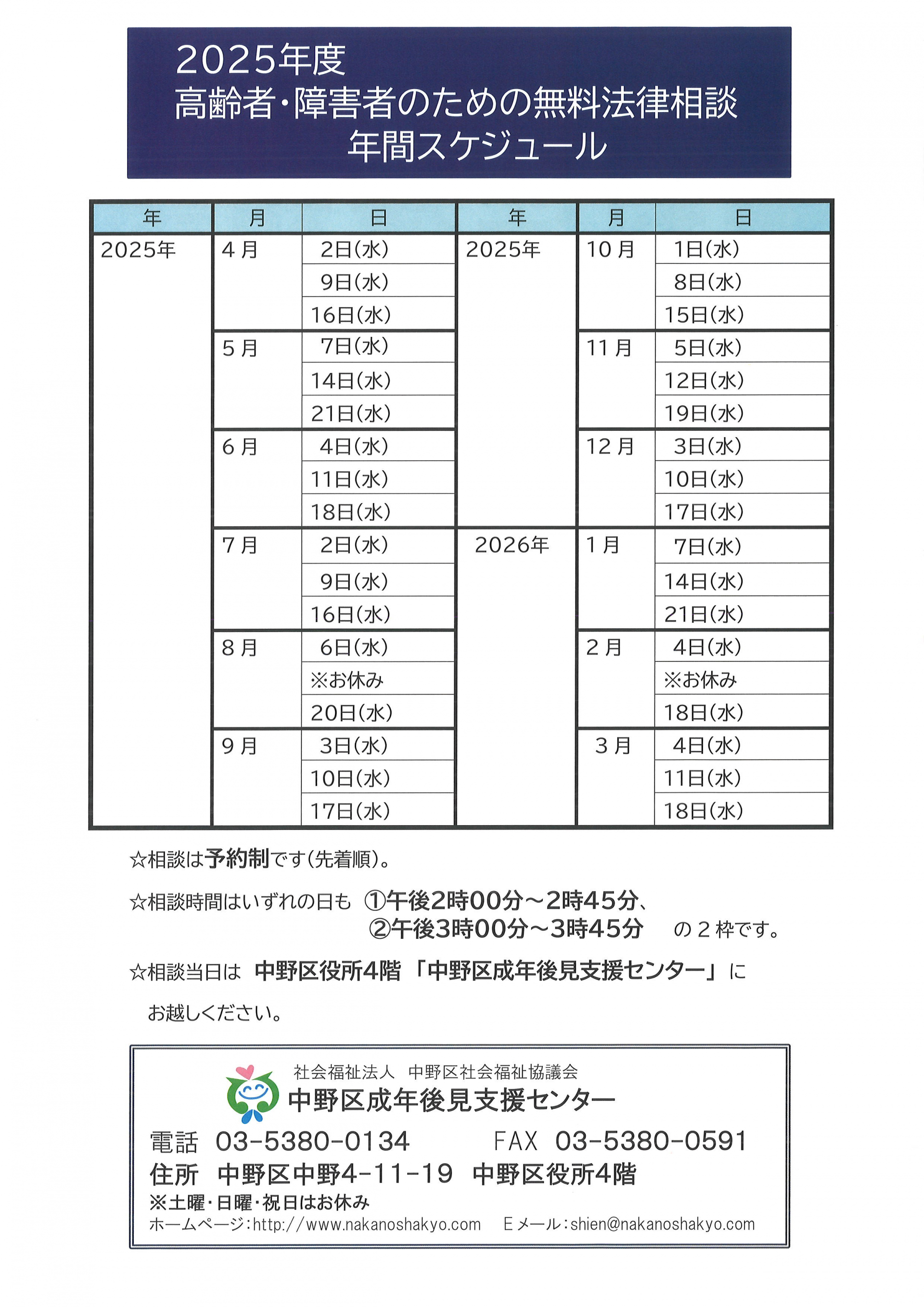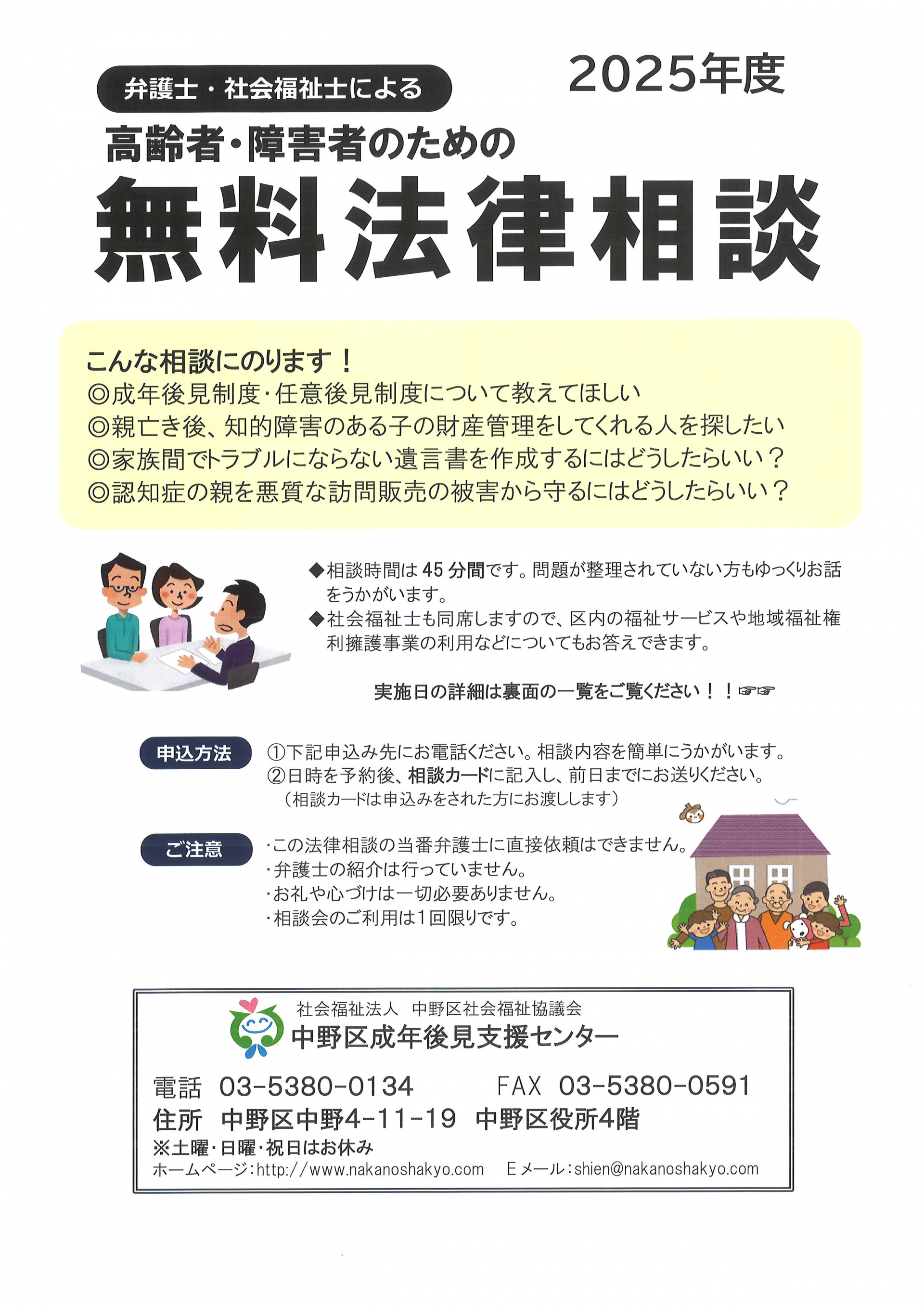 中野区社会福祉協議会で実施している「高齢者・障害者のための無料法律相談」についてお知らせ致します。