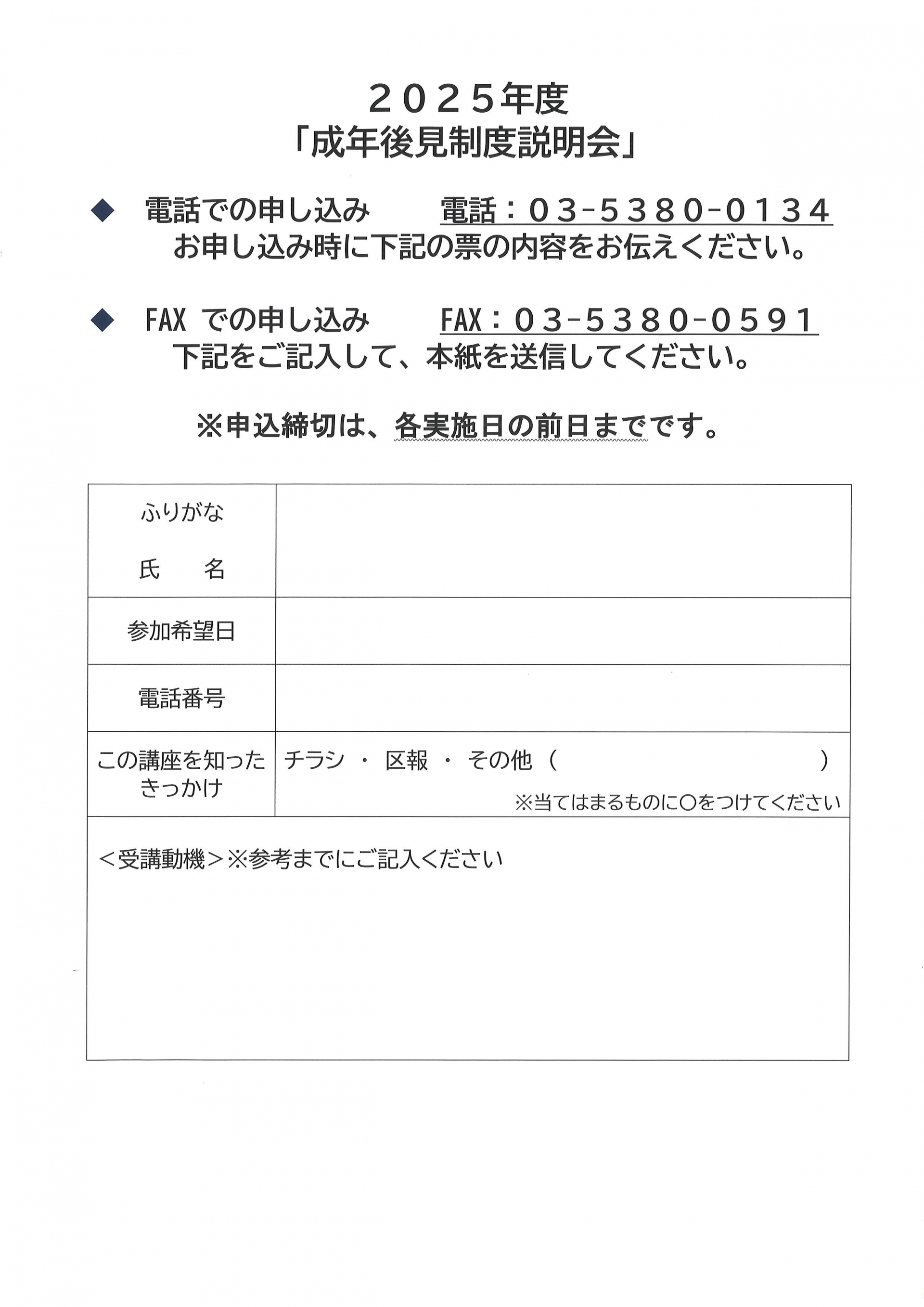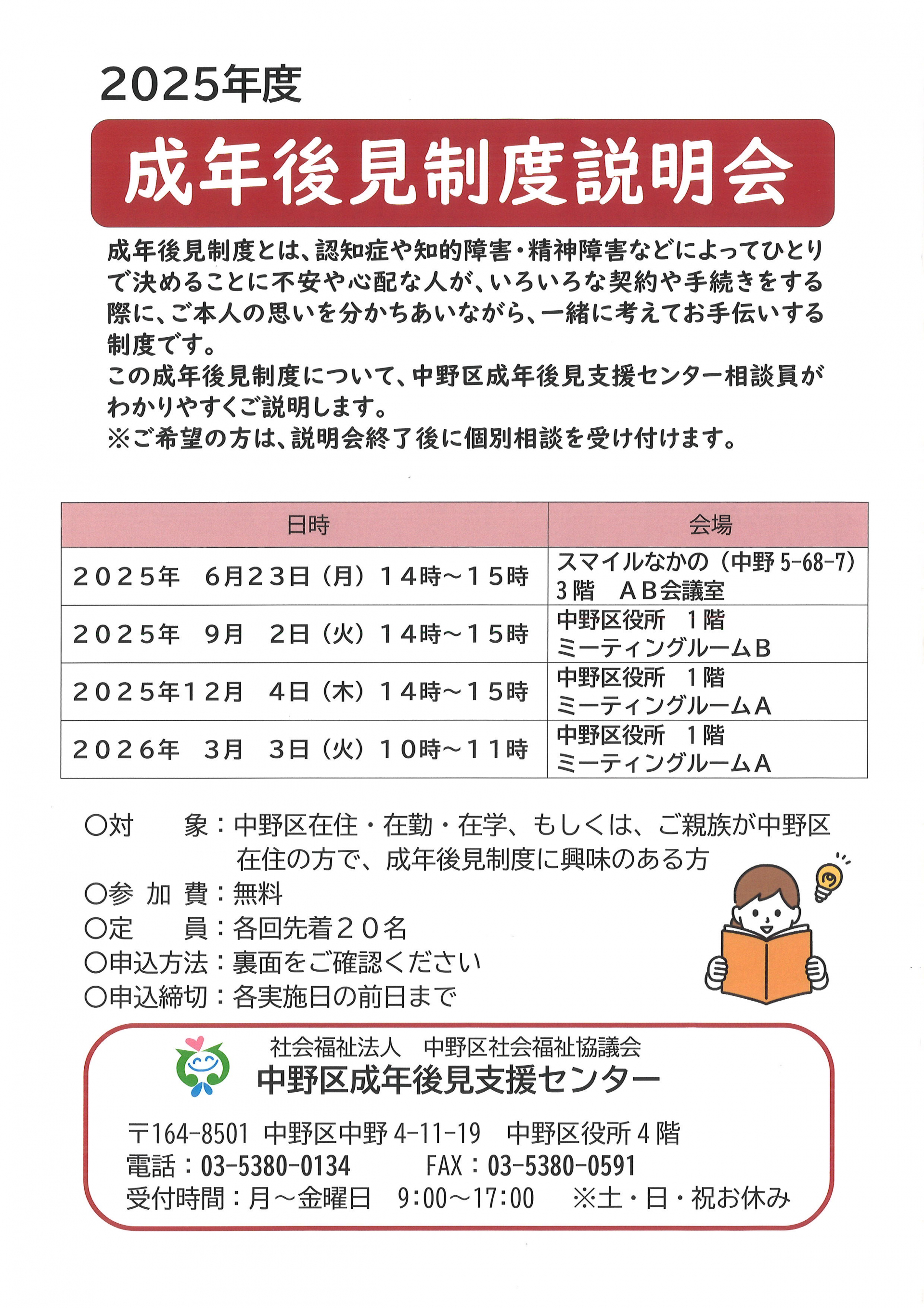 いつも後見制度のことで連携している「中野区社会福祉協議会 成年後見支援センター」が、「成年後見制度説明会」を年4回開催します。