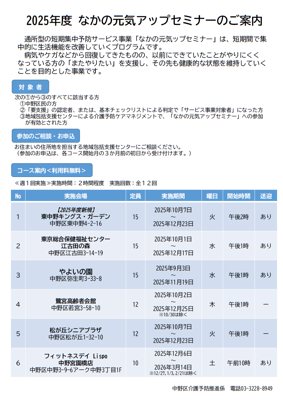対象は、中野区民の方で、要支援の認定者または基本チェックリストによりサービス事業対象者に該当した方のうち、地域包括支援センターによる介護予防ケアマネジメントで、「なかの元気アップセミナー」への参加が有効とされた方です。