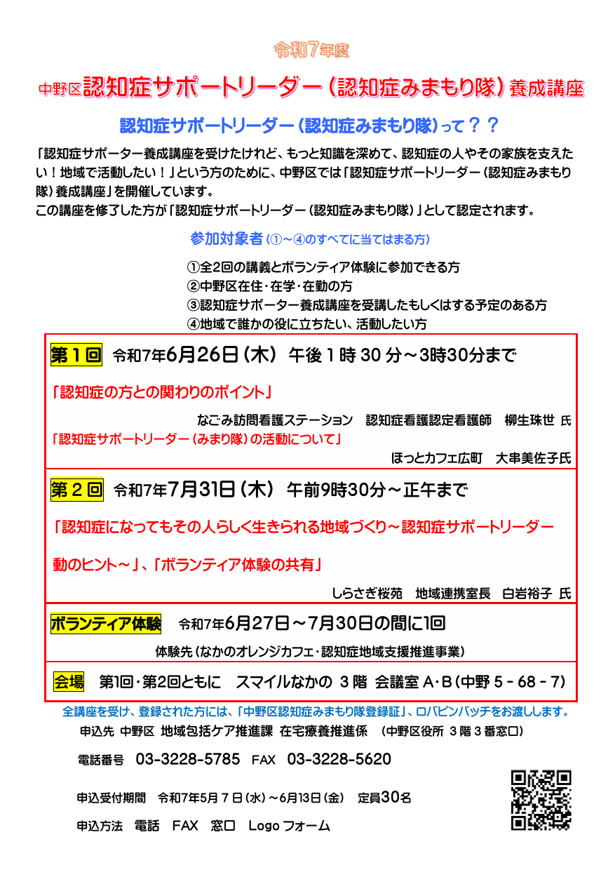 令和7年度 認知症サポートリーダー(認知症みまもり隊)養成講座 | 中野区