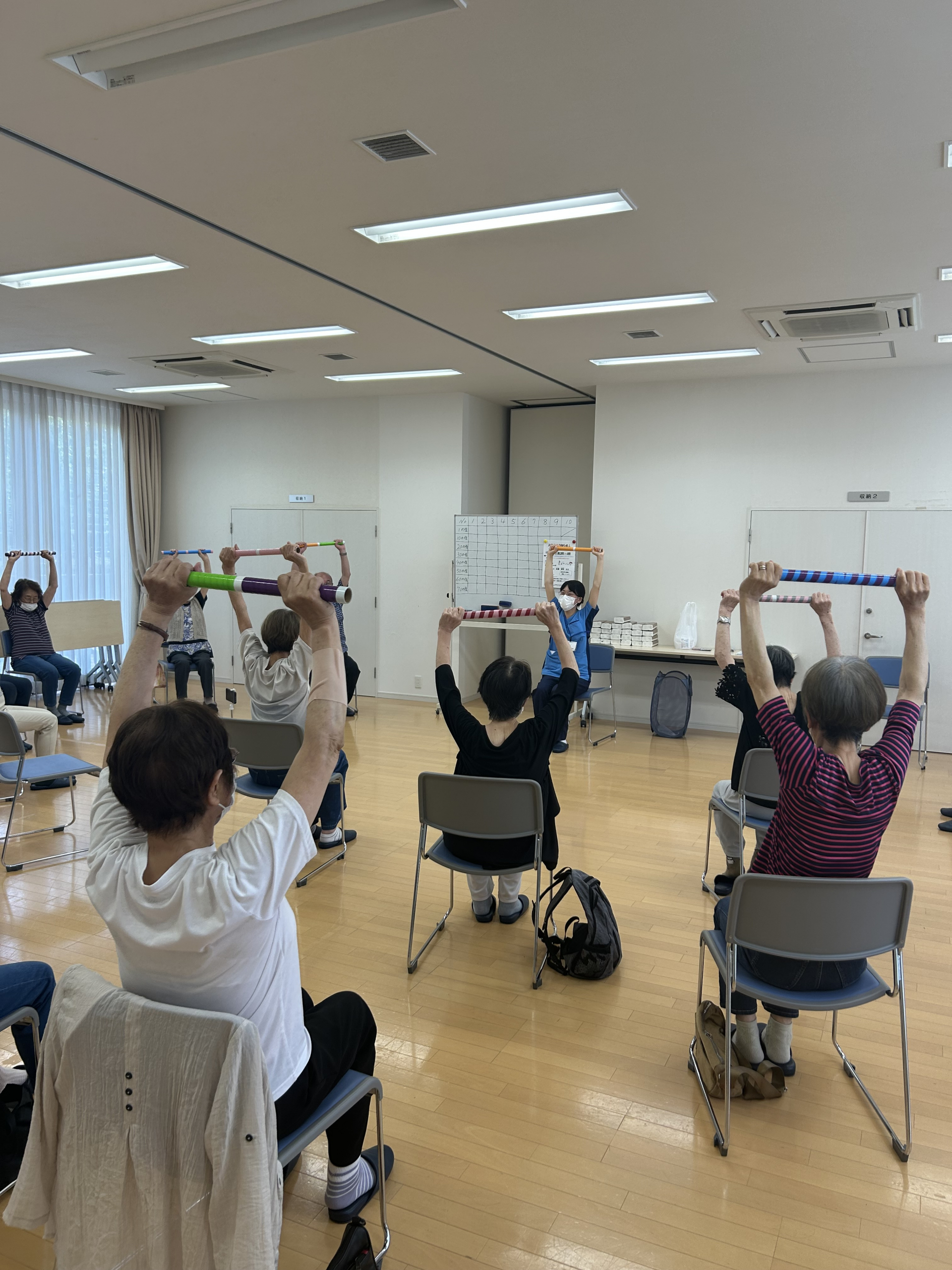 まずは、熱中症の話からしていただき、棒を使いながらの上半身の体操、後半は下半身の体操をメインに行いました。