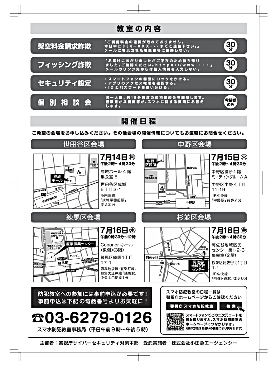 また7月15日には、中野区役所の1階ミーティングルームAにて令和7年度警視庁「スマホ防犯教室」が開催されます。