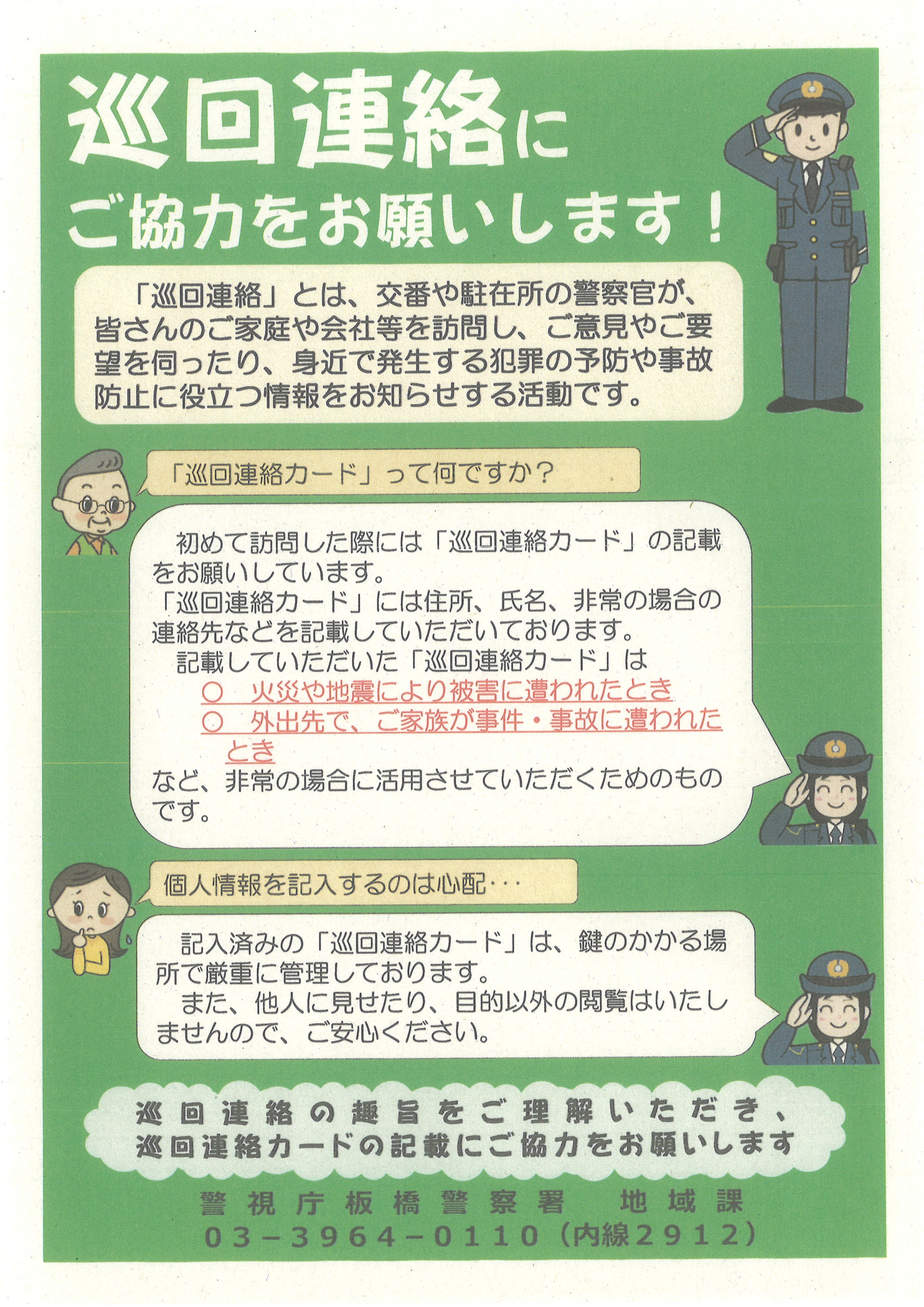 皆さん、「巡回連絡」をご存じですか。交番や駐在所の警察官が、地域のご家庭や会社等を訪問し、要望を聞いたり、犯罪予防などの役立つ情報をお知らせする活動です。