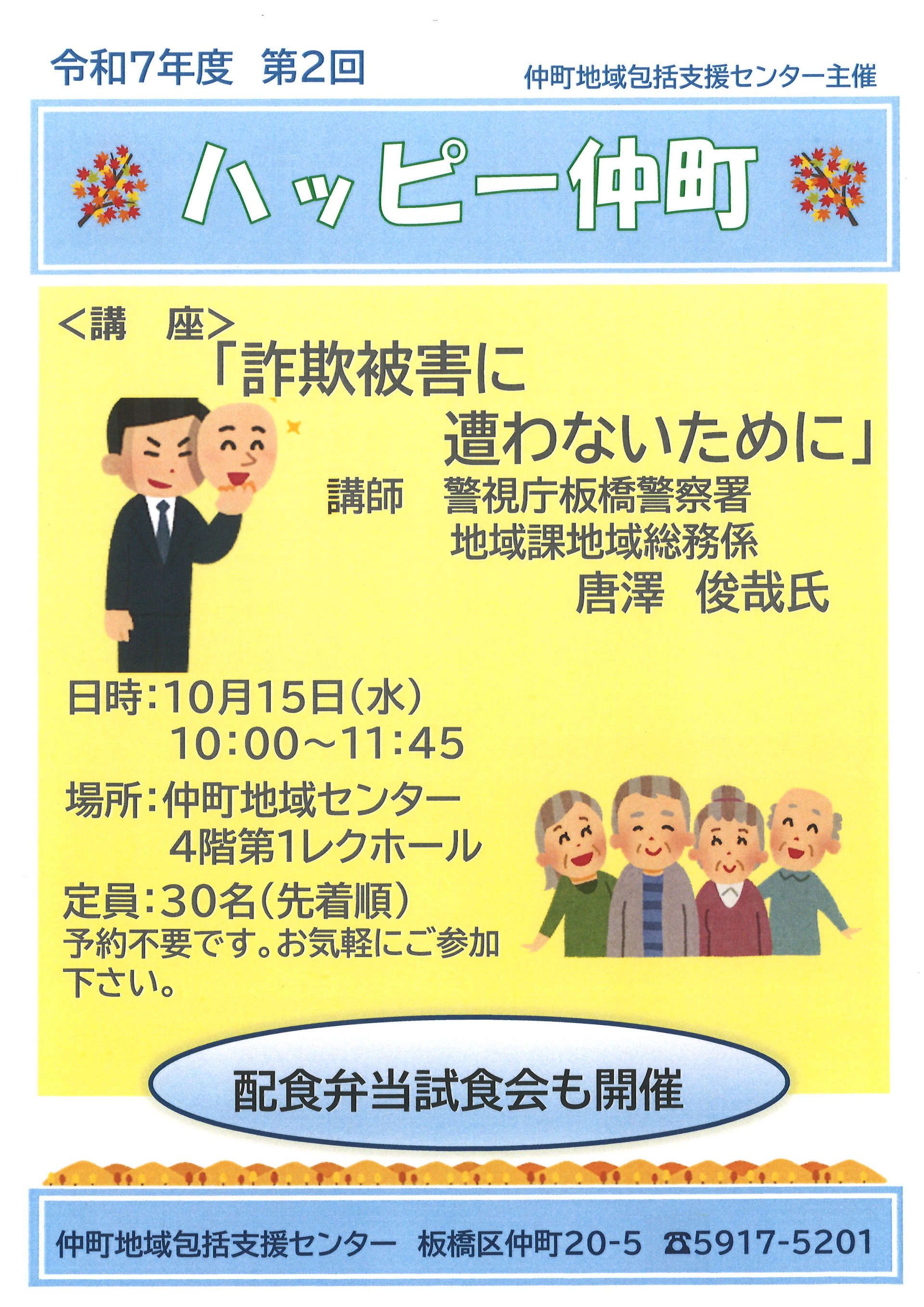 2025.09.11 お知らせ 【仲町包括】ハッピー仲町の開催のご案内 Tweet シェアする 詐欺被害を予防しよう。私は大丈夫と思っていても大丈夫な事を確認しましょう。 前の記事 2025.09.12 お知らせ 【仲町包括】防犯対策の費用支援 次の記事 2025.09.10 お知らせ 【仲町包括】巡回連絡にご協力を 一覧へ戻る