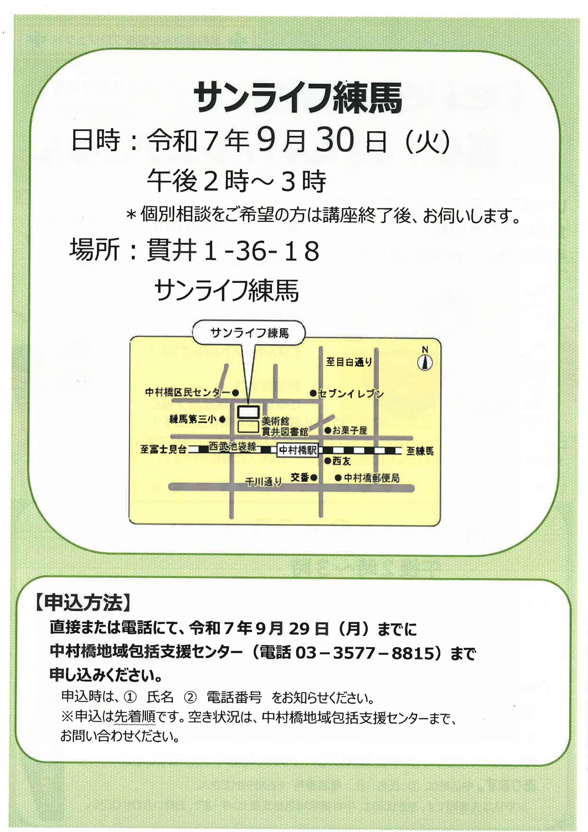 申込は来所、もしくは電話にて中村橋地域包括支援センターにご連絡ください。