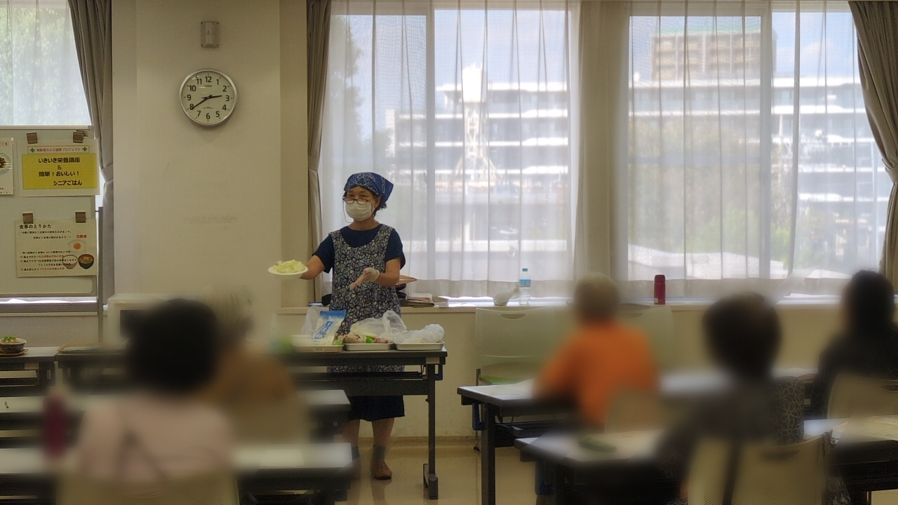 講座の前半は「簡単!おいしい!シニアごはん」のテキストより、フレイルについてや、フレイル予防のための食事のポイントについての紹介、後半は電子レンジにて手軽に作れる料理を3品実演していただきました。