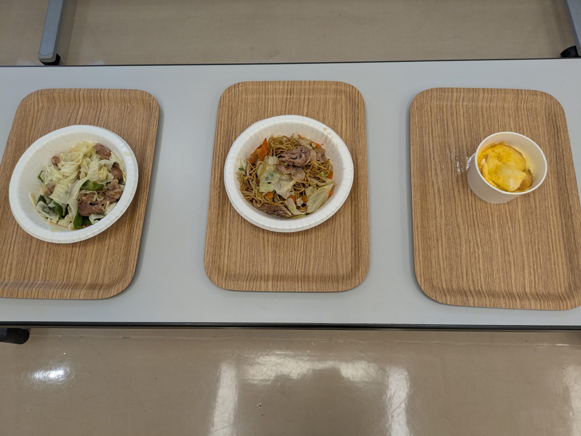 (↑左から、実演で作ったホイコーロー、焼きそば、パンプディングです)