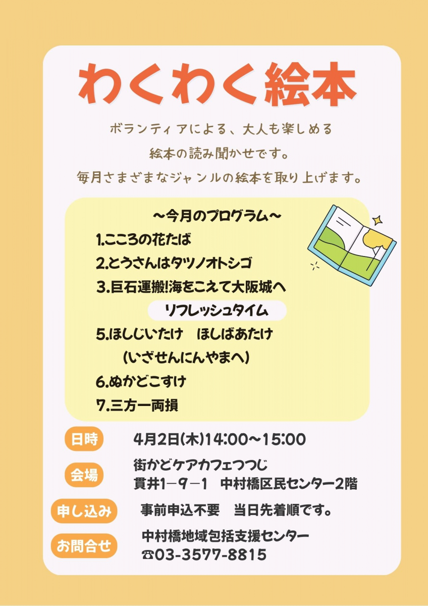 【中村橋包括】【街かどケアカフェつつじ】わくわく絵本を開催します!