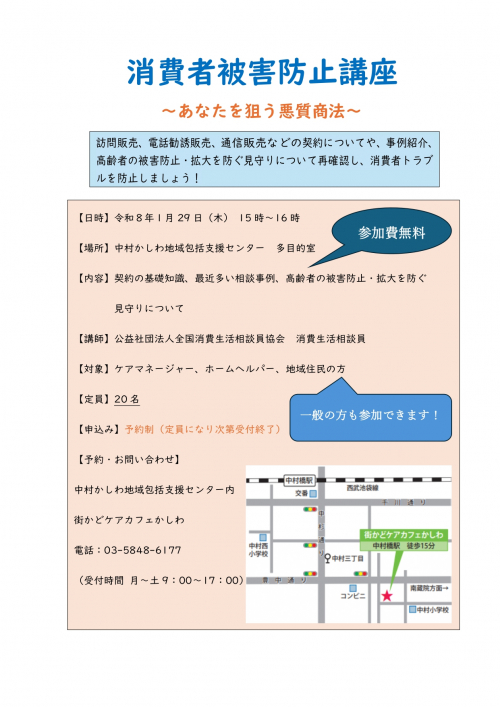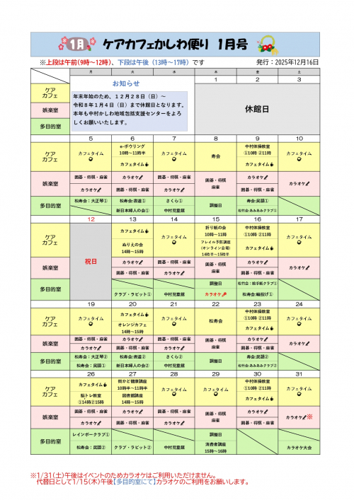 2025.12.16 ケアカフェかしわ便り 令和8年1月号 お知らせ 2025.12.16 【中村かしわ包括】12/16 オレンジカフェを開催しました 活動報告 2025.12.12 【中村かしわ包括】12/12 中村体操教室を開催しました 活動報告 2025.12.11 【中村かしわ包括】12/11 認知機能測定&ベジチェック測定会を開催しました 活動報告 2025.12.10 【中村かしわ包括】12/10 「私の生き方ノート」を書こう 活動報告 2025.12.10 【中村かしわ包括】北町はるのひ包括へ訪問しました! 活動報告 2025.12.09 【中村かしわ包括】12/9 ぬり絵の会を開催しました 活動報告 2025.12.05 【中村かしわ包括】12/5 中村体操教室を開催しました 活動報告 2025.12.04 【中村かしわ包括】12月の本人ミーティングを開催しました 活動報告 2025.12.04 【中村かしわ包括】新年1月29日(木)消費被害防止講座を開催します。 お知らせ 2025.12.02 【中村かしわ包括】素敵なお花を頂きました! 活動報告 2025.12.02 【中村かしわ包括】12/2 eボーリングを開催しました 活動報告 2025.12.02 【中村かしわ包括】12/2ダーツin白金 活動報告 2025.11.29 【中村かしわ包括】第28回ふるさと中村音楽祭を見学しました 活動報告 2025.11.29 【中村かしわ】車いす体験会の振り返り 活動報告 1 2 3 4 5 … 34