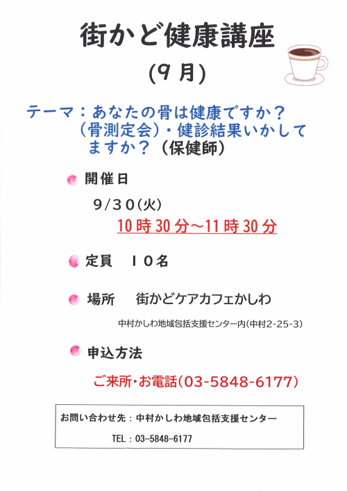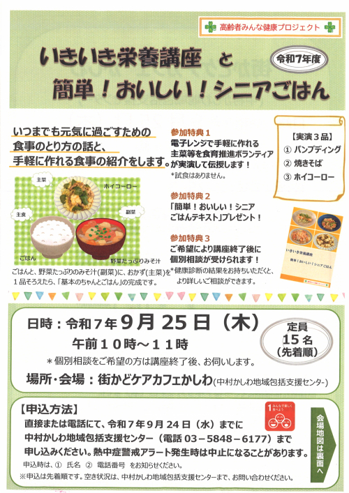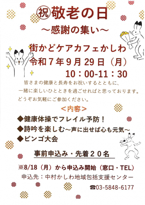 2025.09.18 【中村橋・中村かしわ包括】第2回ケアマネカフェを開催しました。 活動報告(IN) 2025.09.16 【中村かしわ包括】9/16 オレンジカフェを開催しました 活動報告 2025.09.13 【中村かしわ包括】敬老の日の感謝の集いを開催します! 活動報告(IN) 2025.09.12 【中村かしわ包括】中村体操教室開催しました! 活動報告(IN) 2025.09.12 【中村かしわ】地域包括ケア事業部 広報委員会より動画更新のお知らせ お知らせ 2025.09.05 【中村かしわ包括】青少年育成第三地区委員会の勉強会に参加しました。 活動報告(IN) 2025.09.02 【中村かしわ包括】9/2(火)e-ボウリングを開催しました 活動報告 2025.08.26 街かど健康講座(9月)を開催します! お知らせ 2025.08.26 9/25(木)「いきいき栄養講座とシニアご飯」を開催します! お知らせ 2025.08.22 中村かしわ包括【敬老の日】~感謝の集い~申し込み開始しました。 お知らせ 2025.08.19 【中村かしわ包括】熱中症講座を開催しました!! 活動報告 2025.08.14 【中村かしわ包括】9月から体操教室再開します! お知らせ 2025.08.08 【中村かしわ包括】奉優会 職員バスツアーを開催しました。 法人情報 2025.08.02 【中村かしわ包括】奉優会・見守り推進委員会に参加しました 活動報告 2025.08.02 【中村かしわ包括】中村東ふれあいフェスタ実行委員会に参加しました 活動報告 1 … 3 4 5 6 7 … 32
