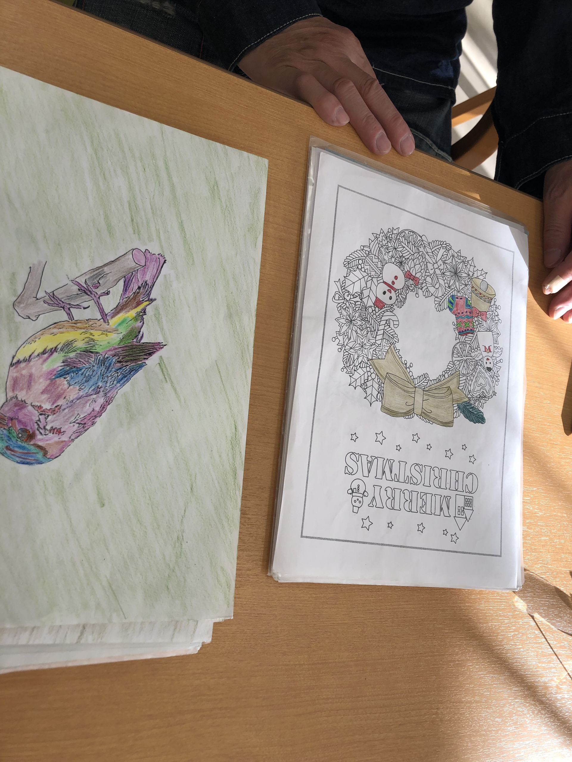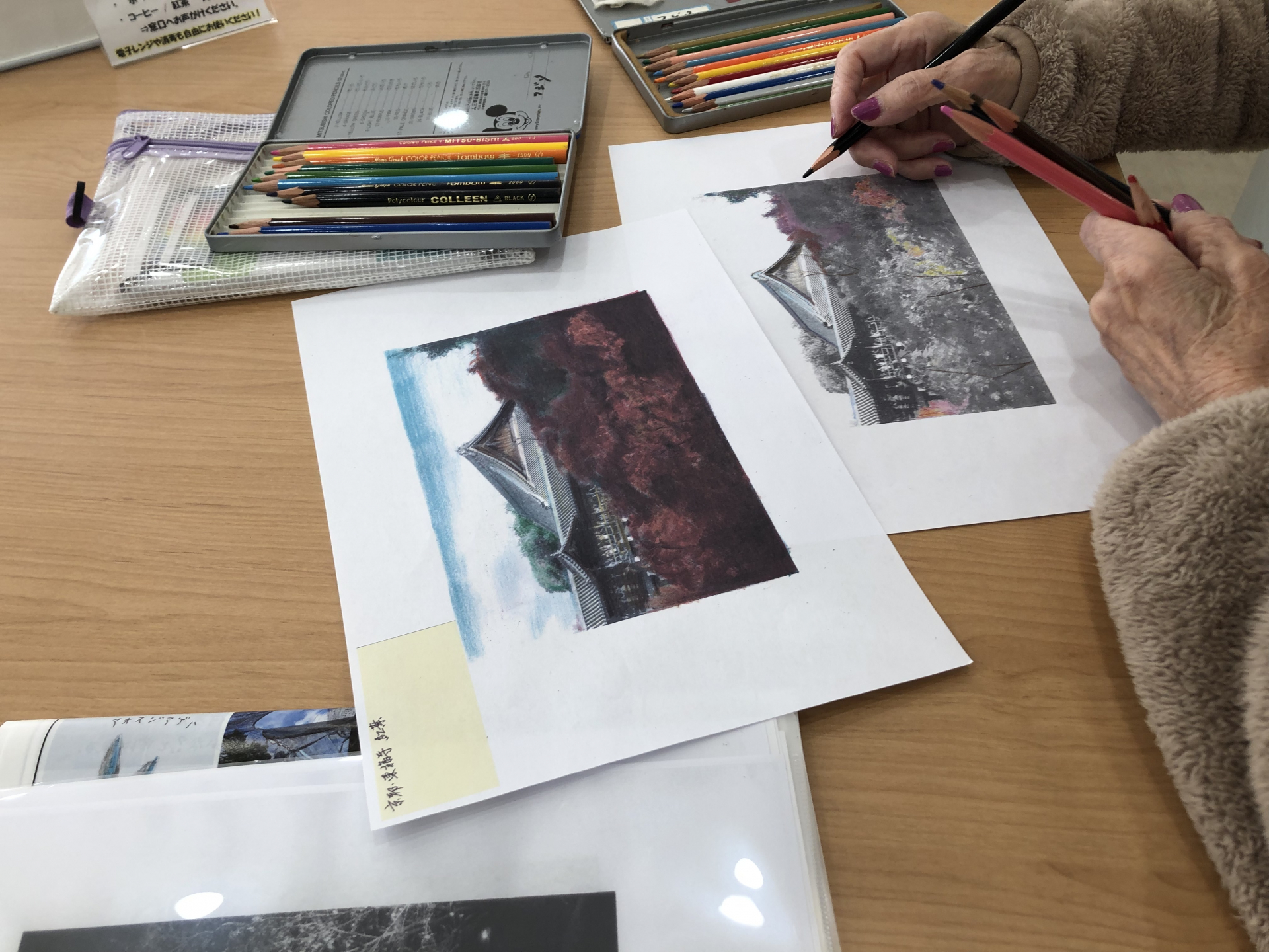 2枚目のぬりえは、京都の紅葉の写真をモノクロ印刷してその上から色鉛筆で塗っているそうです。