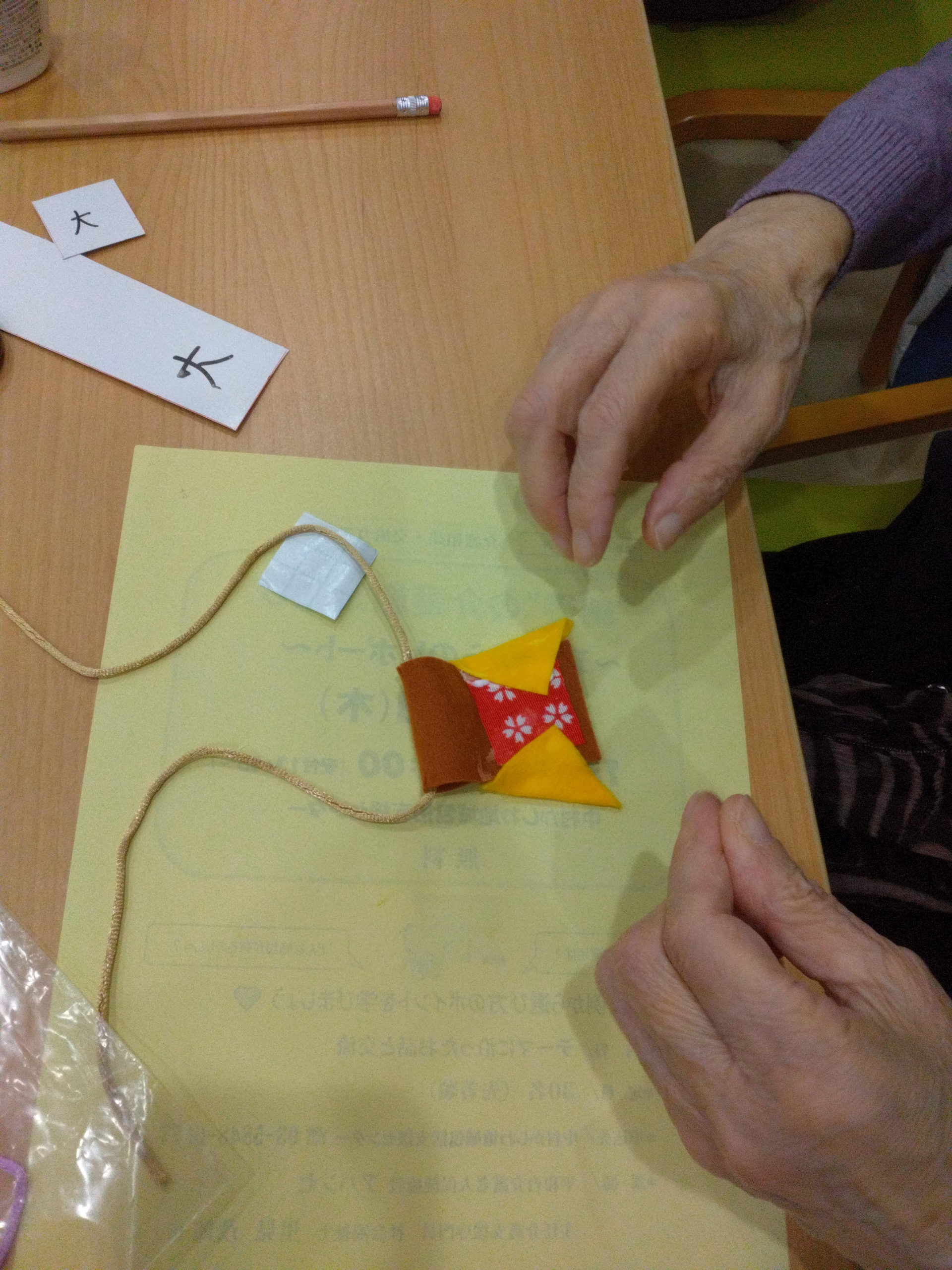 本日の作業は、フェルトの色選び、切り取り、目玉やリボンの貼り付け、紐飾りの工程で、1時間かけて2羽の親子を完成させました。