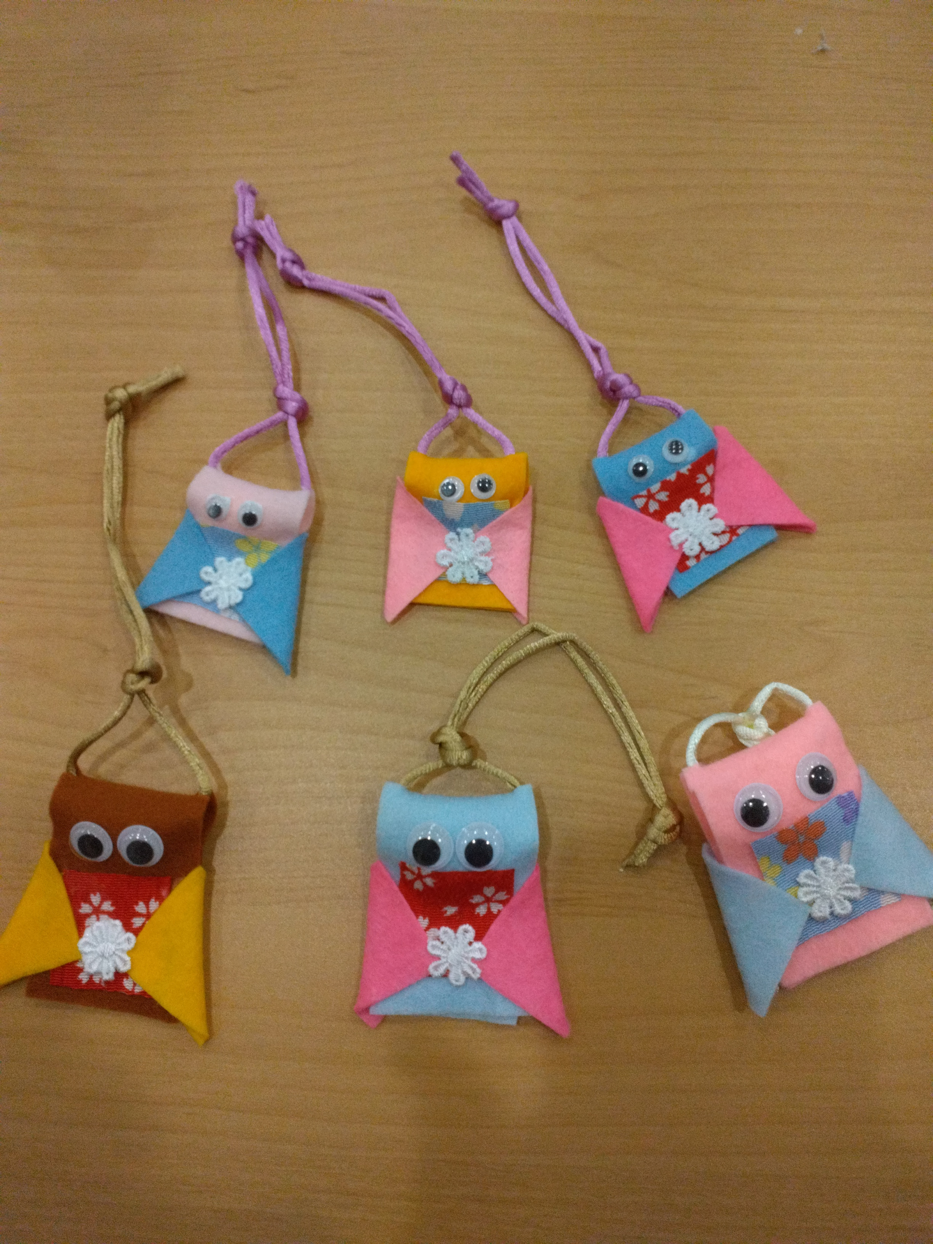 みなさま、それぞれに可愛らしい「フクロウ親子のお守り」が出来上がりました。