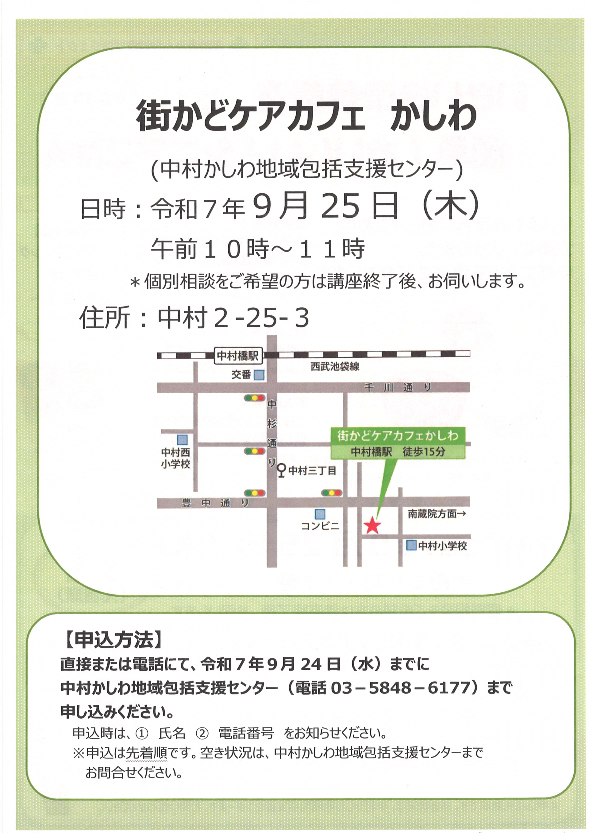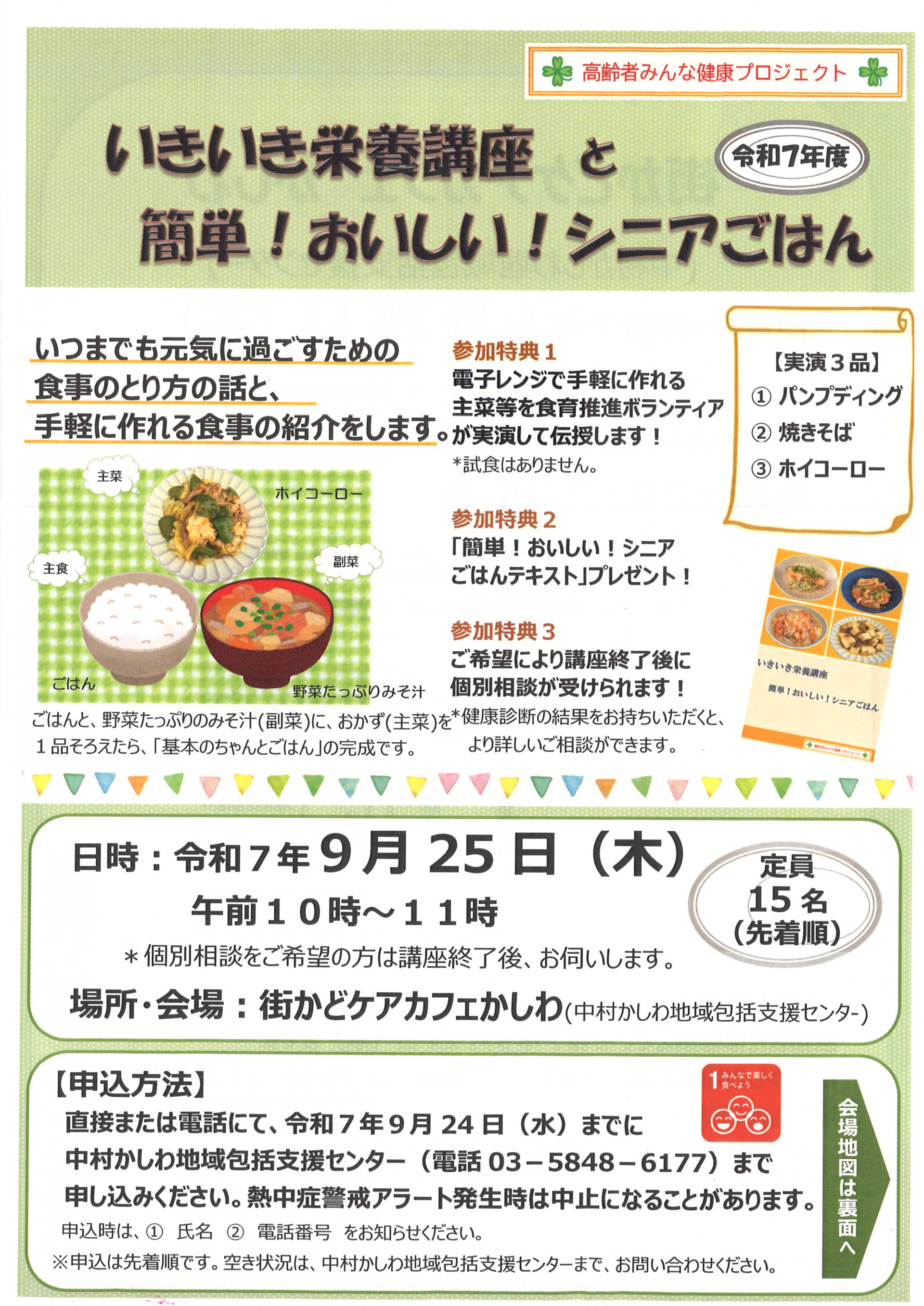 2025.08.26 お知らせ 9/25(木)「いきいき栄養講座とシニアご飯」を開催します! Tweet シェアする 9月25日(木)10時~11時 いきいき栄養講座と簡単!おいしい!シニアごはんを開催します! 事前申込制となります。皆様ぜひご参加ください☆ 前の記事 2025.08.26 お知らせ 街かど健康講座(9月)を開催します! 次の記事 2025.08.22 お知らせ 中村かしわ包括【敬老の日】~感謝の集い~申し込み開始しました。 一覧へ戻る