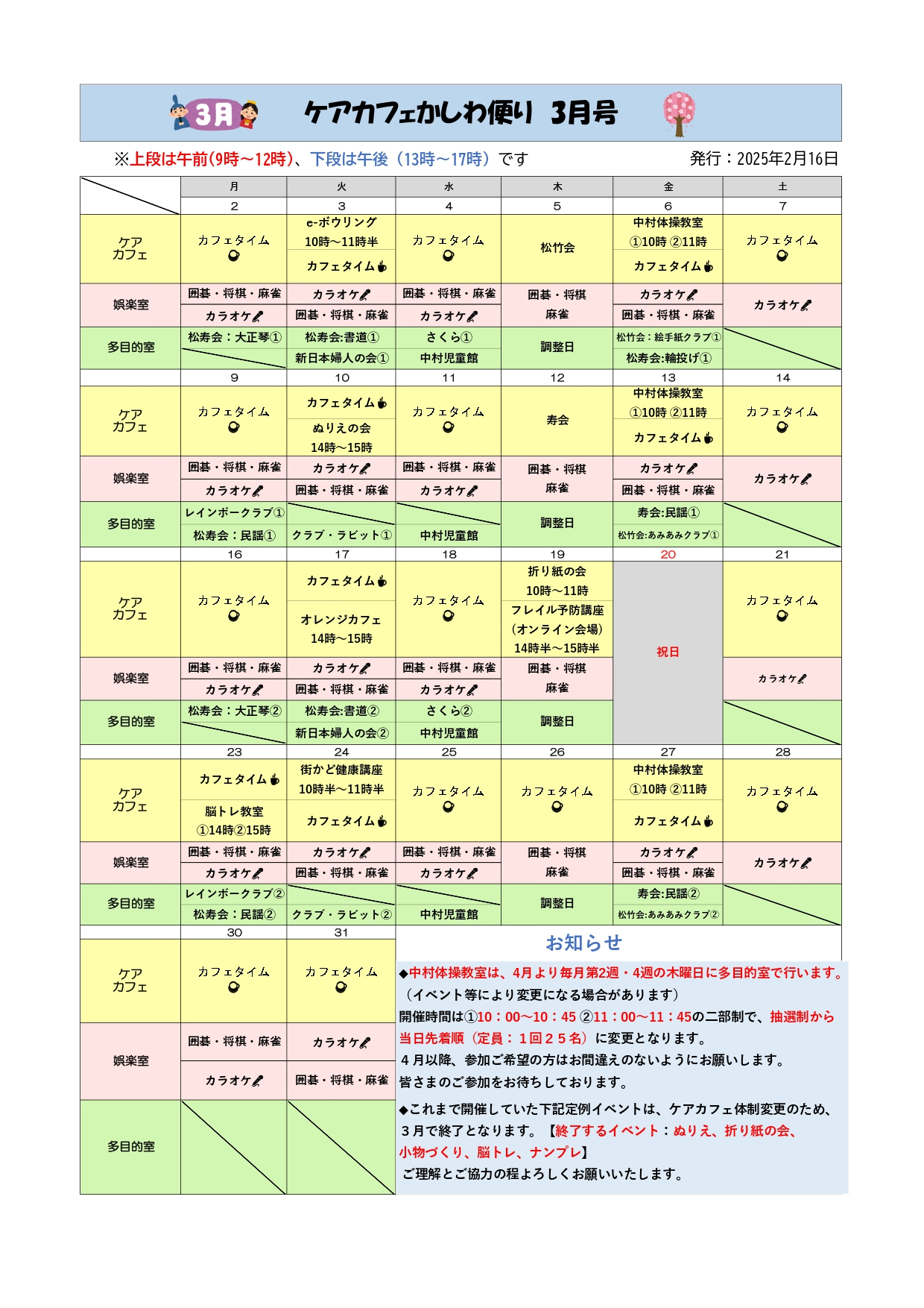 3月で終了となります。【終了するイベント:ぬりえ、折り紙の会、小物づくり、脳トレ、ナンプレ】