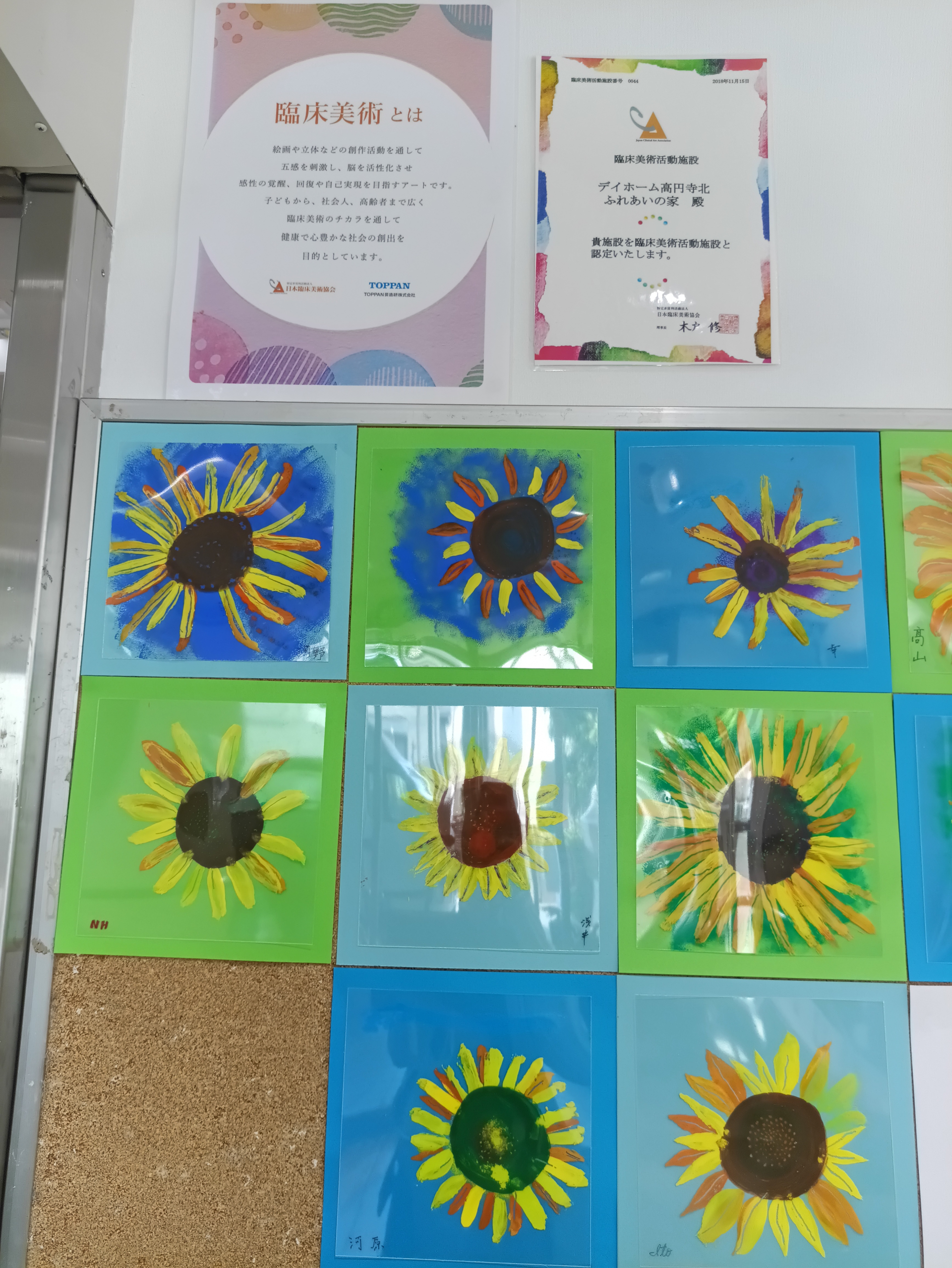 利用者様作の素敵なひまわりの絵画が沢山、飾られており、