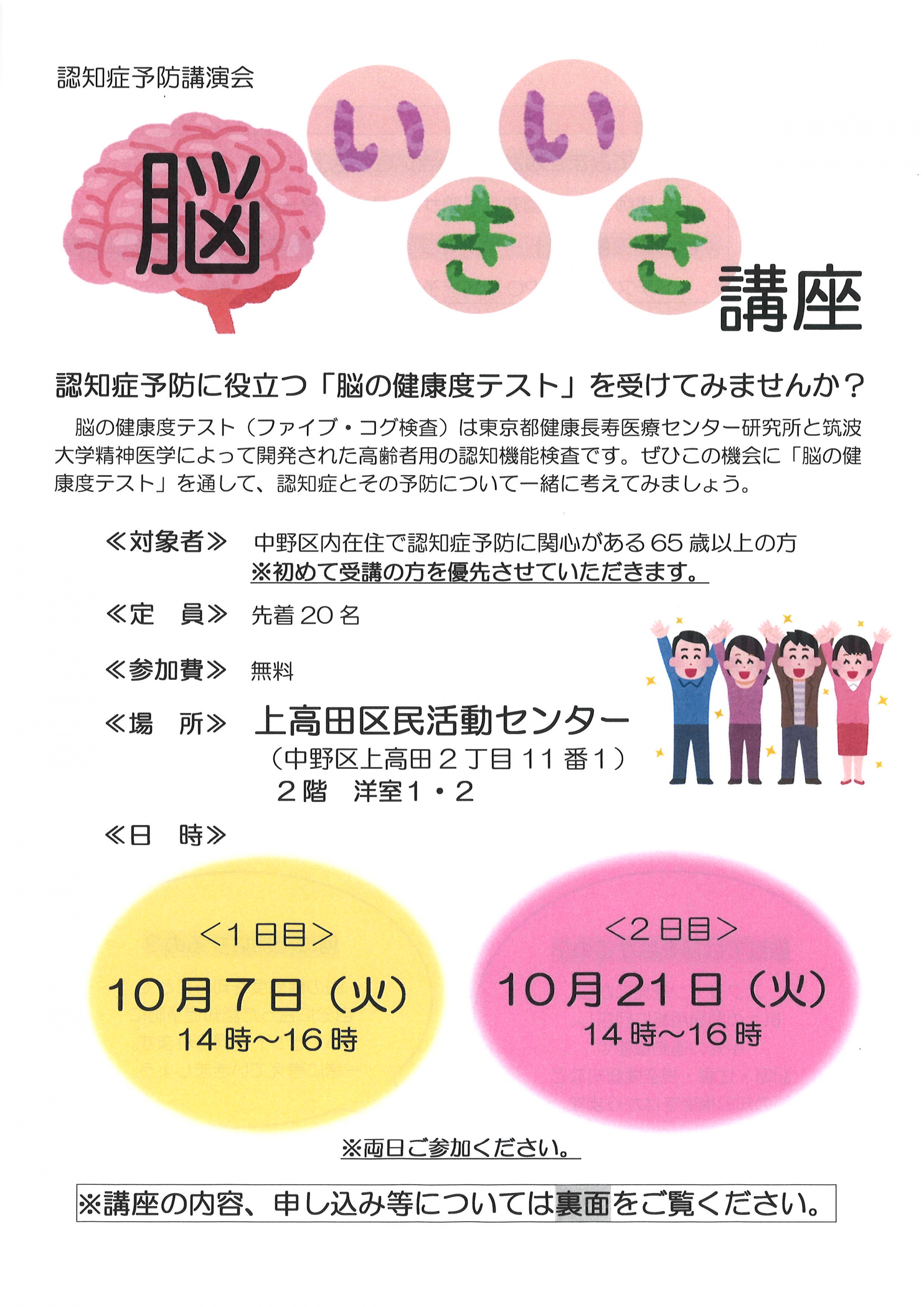 10月7日(火)、10月21日(火)14:00~16:00で上高田区民活動センター(2階洋室1・2)で脳いきいき講座を開催します。