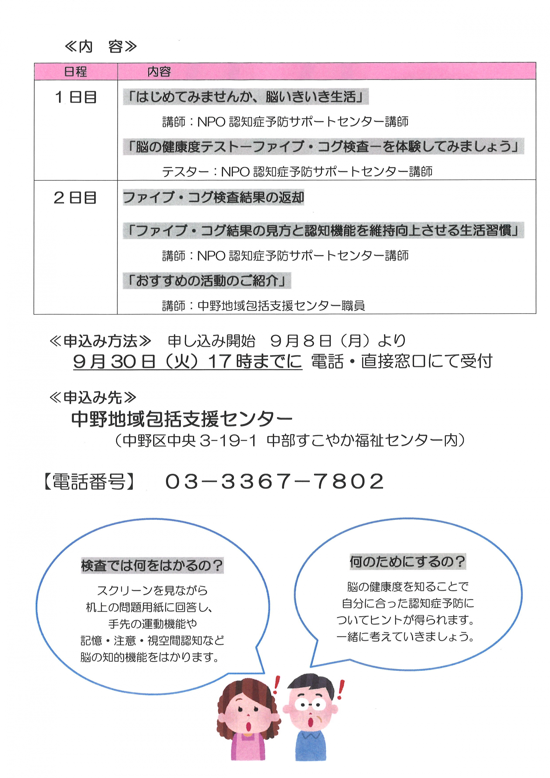申し込み先:中野地域包括支援センター (中野区中央3-19-1 中部すこやか福祉センター内) 03-3367-7802