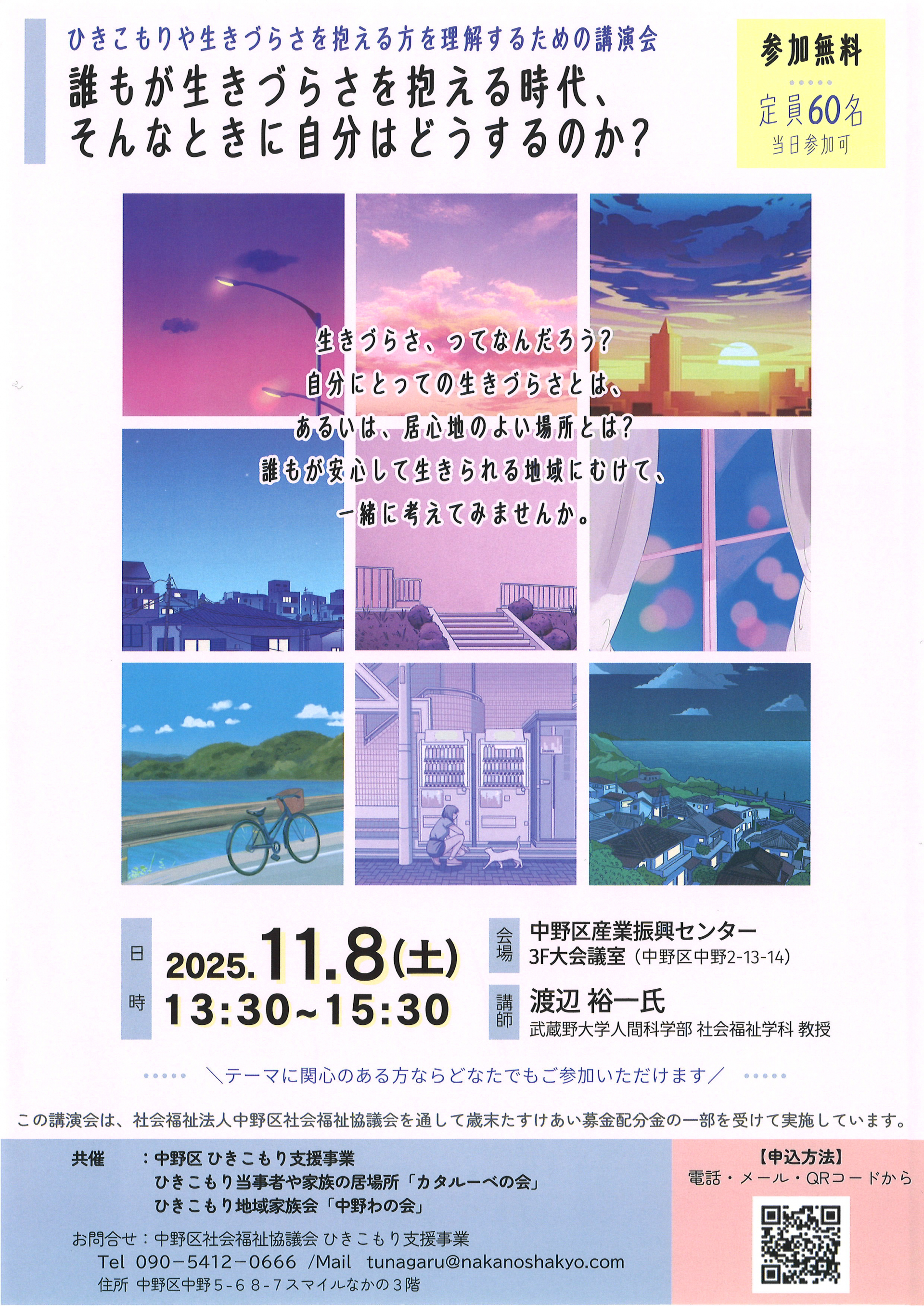 中野区ひきこもり支援事業「ひきこもりや生きづらさを抱える方を理解するための講演会」のお知らせです。