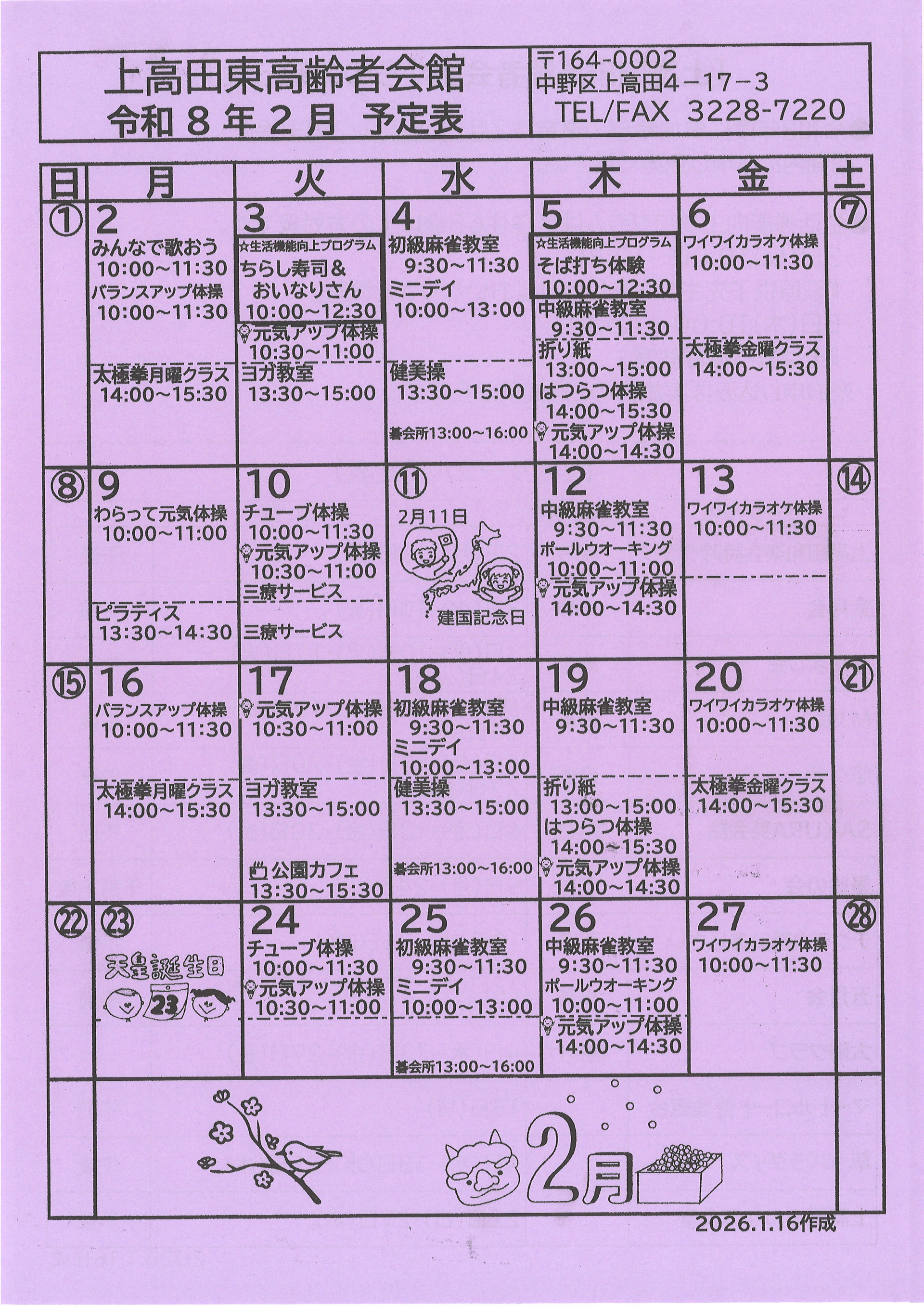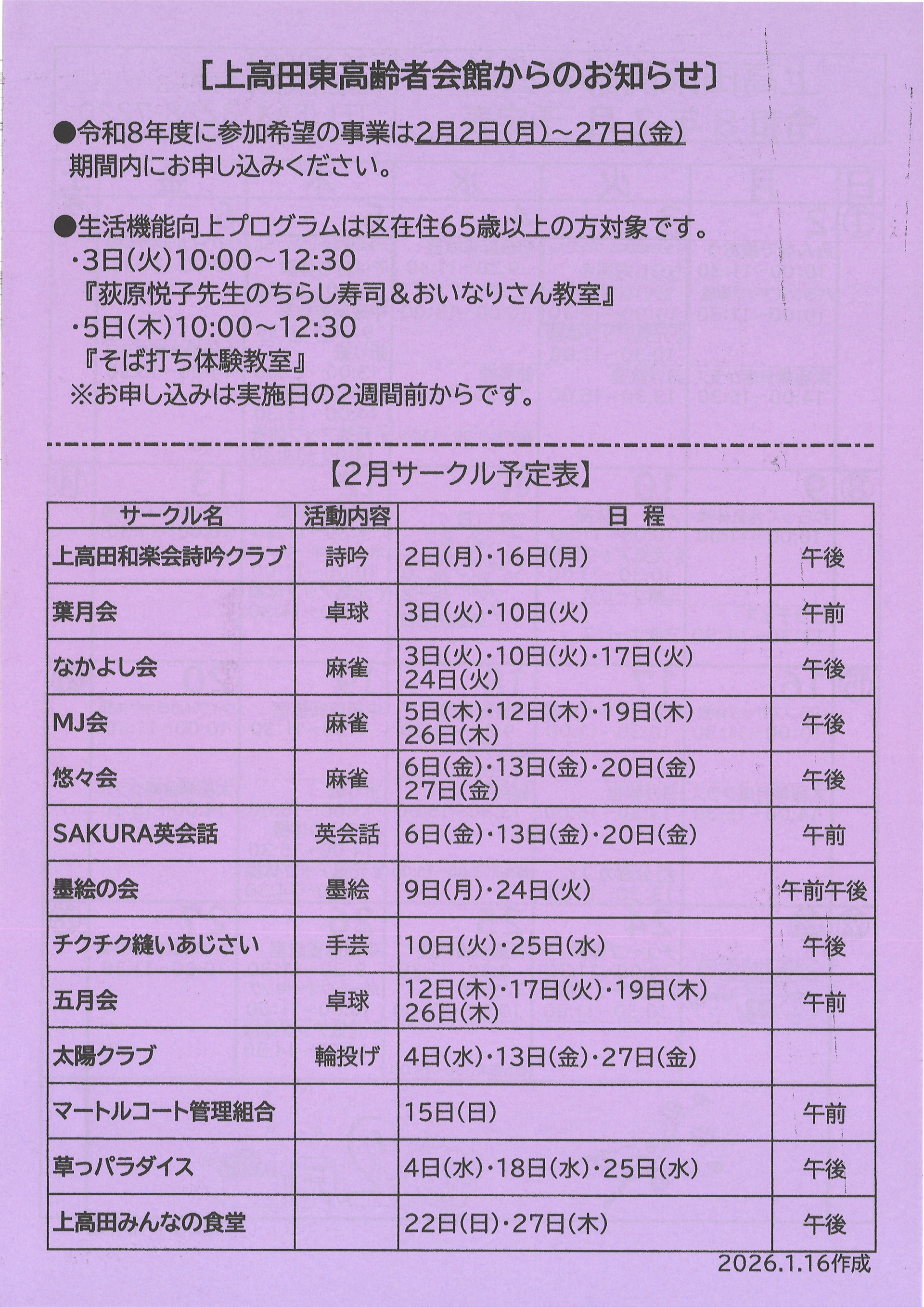 上高田東高齢者会館より令和8年2月のお知らせです。