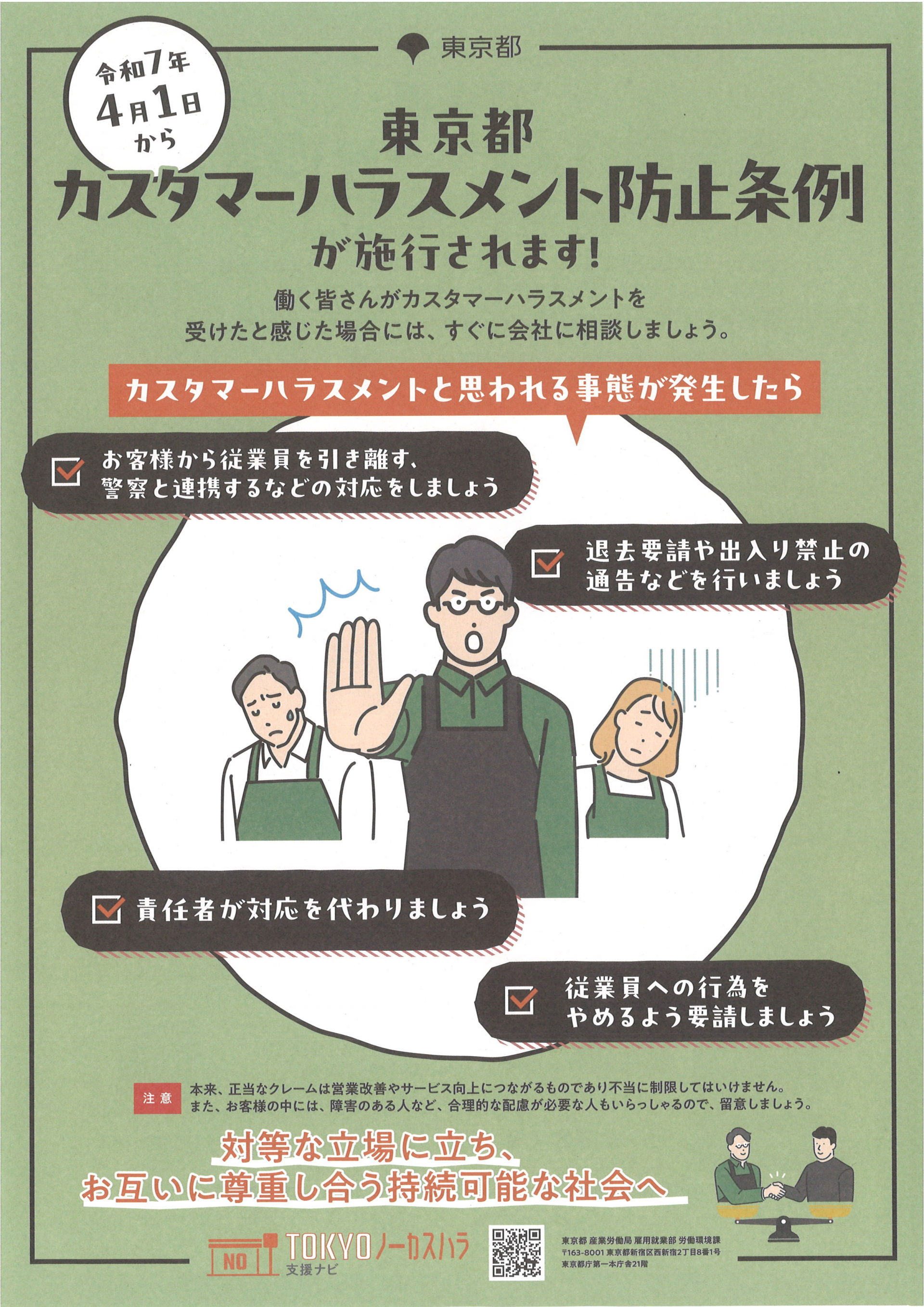 令和7年4月から東京都ではカスタマーハラスメント防止条例の運用が開始されています。