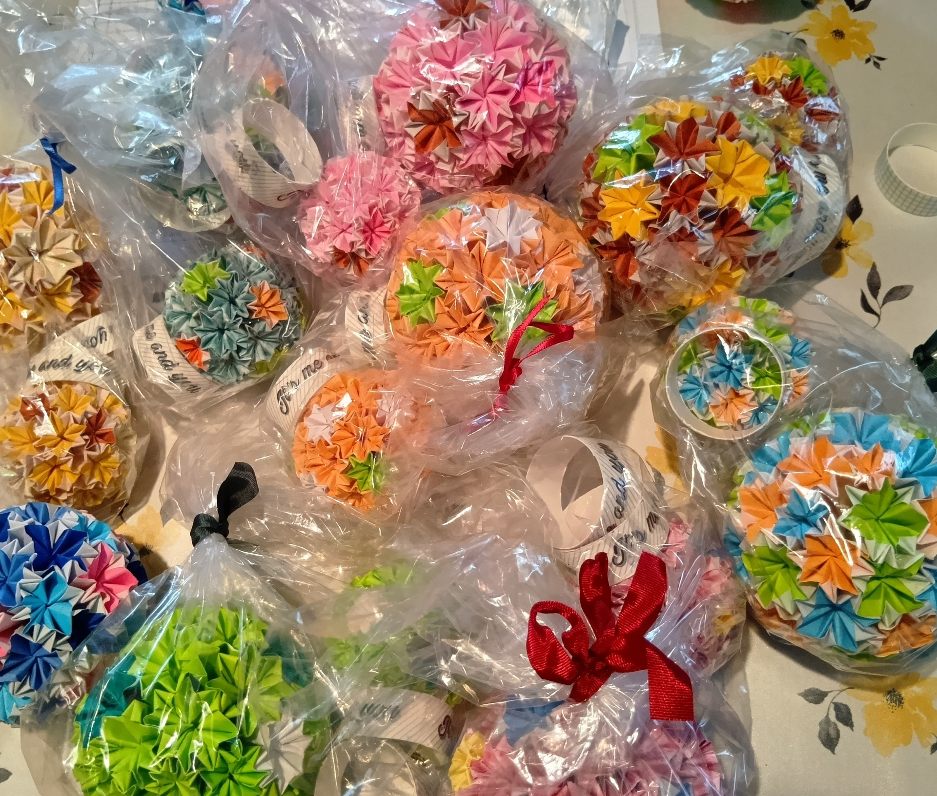 退院後もリハビリと作品作りを続けられ、完成した「くす玉」は贈り物としてキレイにラッピングされています。
