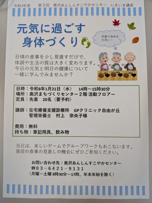 2026.01.27 【奥沢包括】事例研究発表会のご案内 お知らせ #社会福祉法人 #事例研究 2026.01.20 【奥沢包括】ダンディでeスポーツ♪ 活動報告 2026.01.18 【奥沢包括】新春奥沢地区まつりに参加しました! お知らせ #ゆっくり小規模多機能奥沢 #奥沢あんしんすこやかセンター #地域交流 #楽しかった #奥沢包括 2026.01.14 【奥沢包括】1/21(水)いきいき講座開催します 活動報告 #奥沢包括 #栄養講座 #いきいき講座 2026.01.14 【奥沢包括】新年最初のはつらつ介護予防講座 活動報告 #奉優会 #介護予防 #体操 #世田谷区 2026.01.12 【奥沢包括】新春奥沢地区まつりのご案内 お知らせ 2026.01.09 【奥沢包括】おもてなしCAFE開店! 活動報告 #奉優会 #優っくり村 #奥沢あんしんすこやかセンター 2026.01.07 【奥沢包括】若年性認知症の会で初詣 活動報告 2026.01.06 【奥沢包括】ダンディエクササイズ(地域デイサービス)にいってきました! 活動報告 #地域デイサービス #奥沢・東玉川 #地域デイ #奥沢地域 #奥沢地域包括支援センター #奥沢あんすこ #おやつ作り #グループホーム恵比寿西二丁目 #奥沢地域包括センター #奥沢あんしんすこやかセンター #参加者募集中 #ダンディ 2026.01.05 【奥沢包括】新年のごあいさつ お知らせ #奥沢あんしんすこやかセンター 2025.12.27 【奥沢包括】年末のご挨拶 お知らせ #地域包括支援センター #いつもありがとうございます #年末のごあいさつ 2025.12.27 【奥沢包括】地域と共に取り組む~動画をご覧ください! お知らせ 2025.12.24 【奥沢包括】地域デイサービス「ダンディエクササイズ」に参加してきました! 活動報告 #奥沢包括 #ダンディエクササイズ #あんしんすこやかセンター #世田谷区 #笑顔 #奥沢 #奥沢あんしんすこやかセンター 2025.12.24 【奥沢包括】年内最後のはつらつ介護予防講座 活動報告 2025.12.24 【奥沢包括】季節を感じる時間 活動報告 #世田谷区 #楽しい #高齢者 #クリスマス #地域活動 #奥沢 #奥沢あんしんすこやかセンター #地域包括支援センター #地域 #12月 #奥沢あんすこ #奥沢包括 #楽しい時間 #奥沢地区 #包括 #奥沢・東玉川 1 2 3 … 35