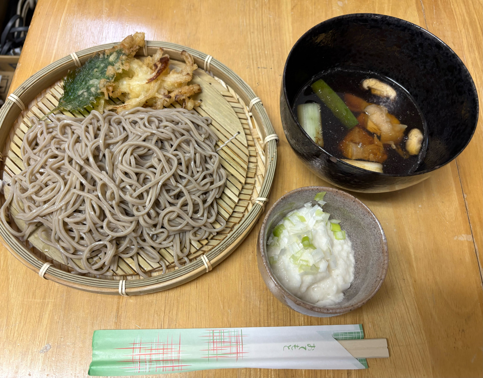 本日のメニューは「とり汁つけ蕎麦」!なんと天ぷらととろろ付きです。