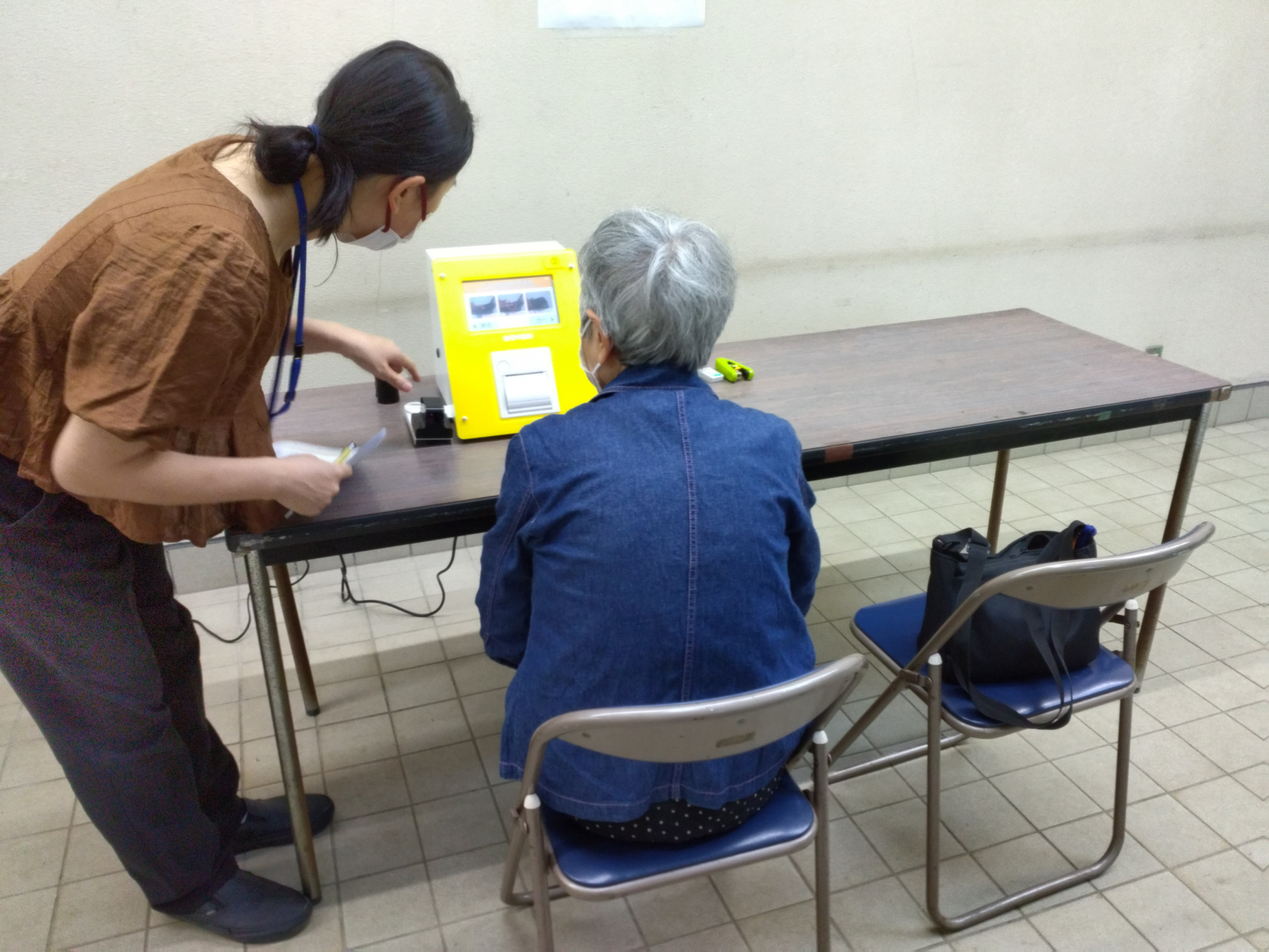 この写真はわたしが参加者の方の血管年齢を測定しているところです。