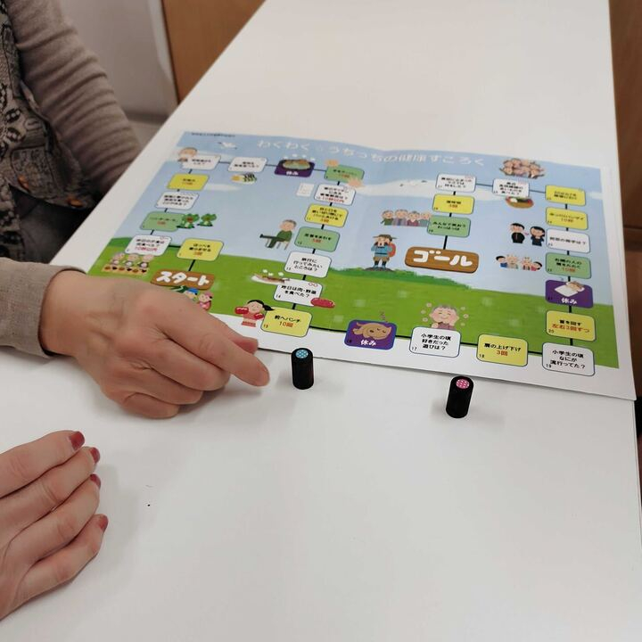 最後は、参加者で「健康すごろく」をしました。健康すごろくは、脳トレや軽い体操などを組み合わせてあり、楽しみながら介護予防が出来ました。