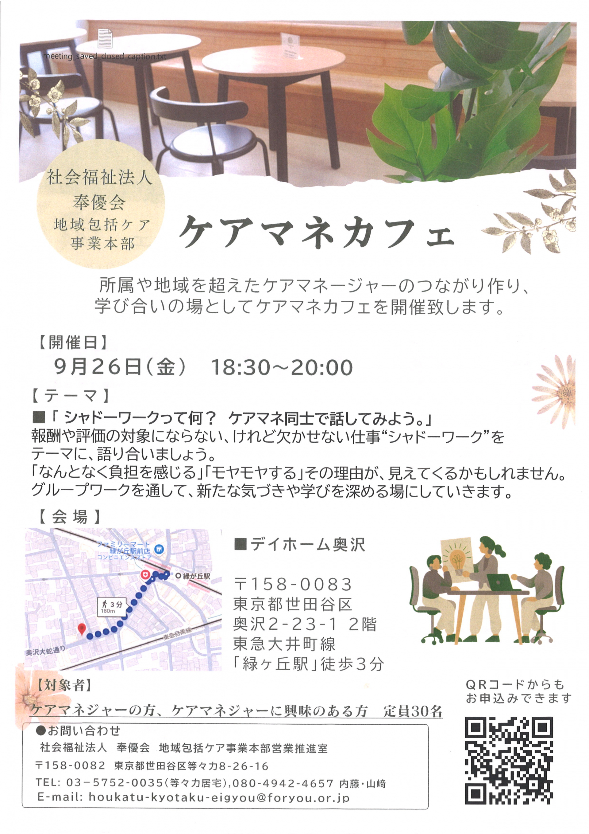 来たる9月26日(金)18時30分~20時まで、デイホーム奥沢にてケアマネカフェが開催されます。