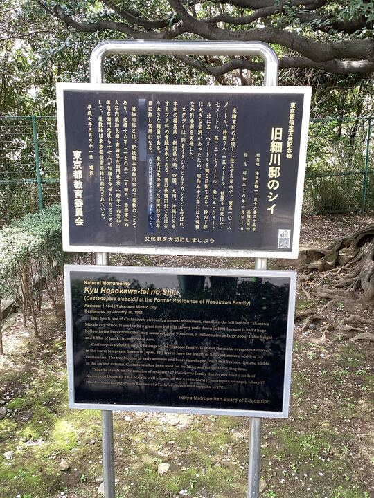 旧細川邸とは、肥後熊本藩細川邸のことで、下屋敷には植えられていたスダジイの木が現在も残っており、東京都指定天然記念物になっています。