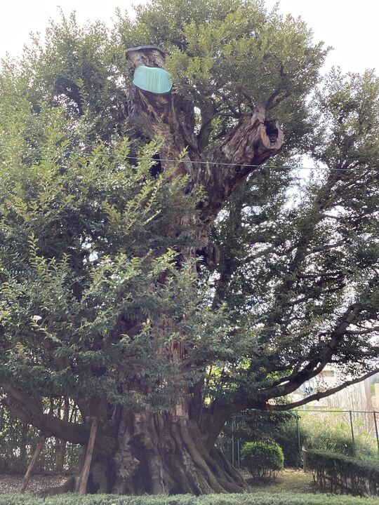 実際のシイがこちらです。樹高が10.8メートルあるそうですが、残念ながら主幹は10m程の所で切られているようです。