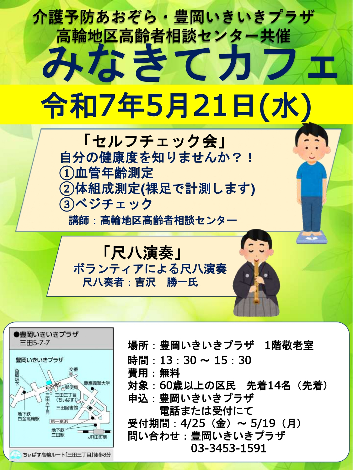 介護予防あおぞら、豊岡いきいきプラザ、高輪地区高齢者相談センターで共催し、セルフチェック会とボランティアの吉沢勝一氏による尺八の演奏を行います。