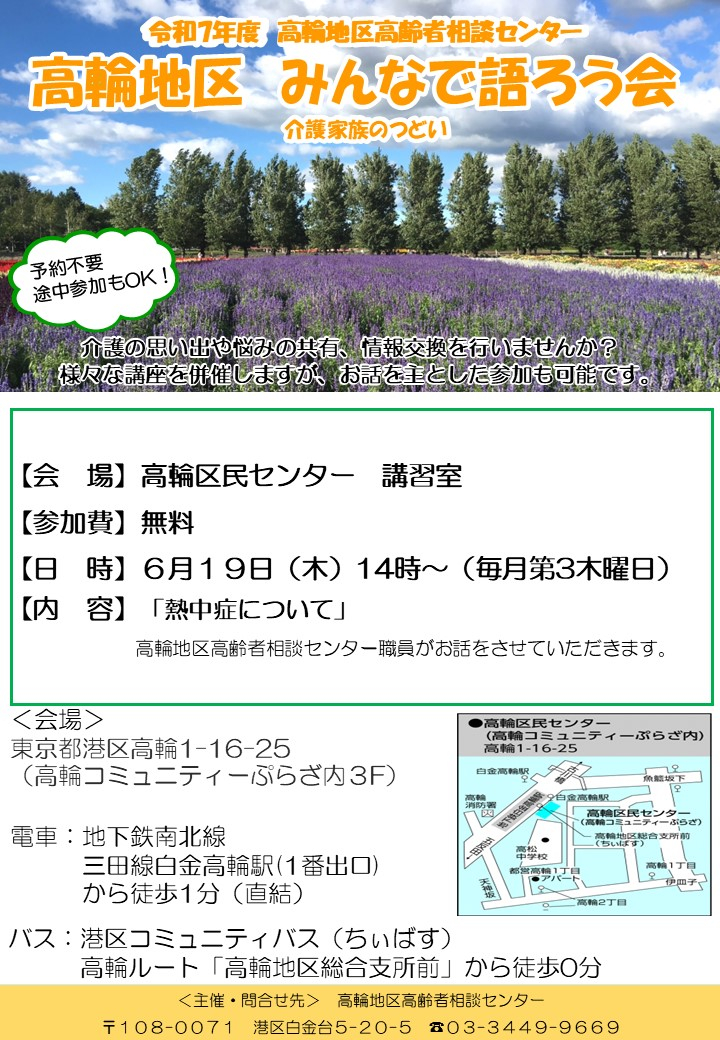 6月19日(木)14時から高輪区民センター講習室にて「高輪地区みんなで語ろう会(介護家族のつどい)を開催いたします。