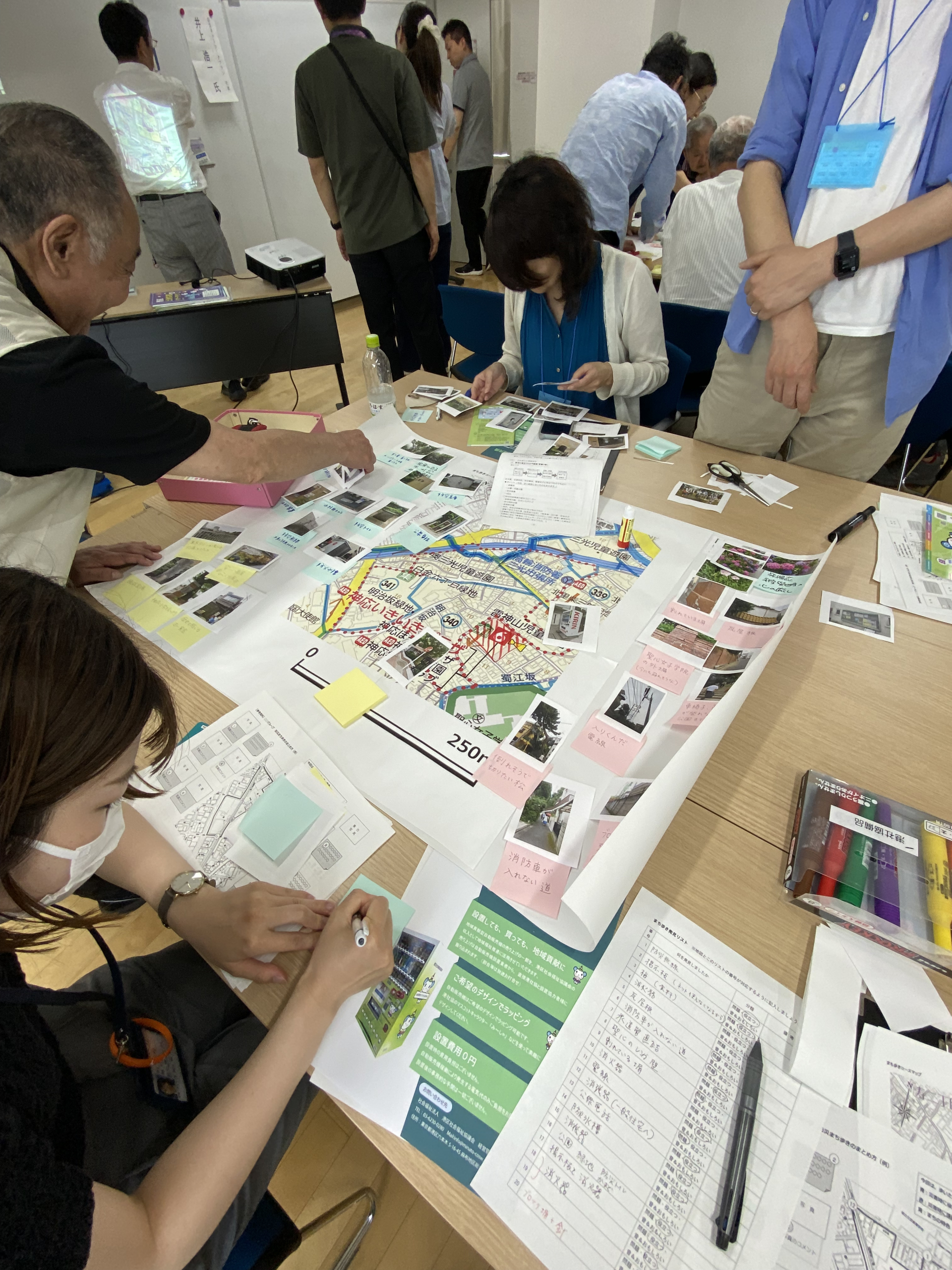 もう、楽しいのなんの!撮ってきた写真にコメントを付けて、地図の周りにペタペタと貼り付けていきます。「ここがこうだったね~」「これすごいよね!」とか言いながら、ワイワイと防災地図を作っていきました。